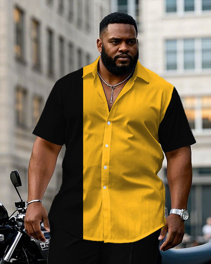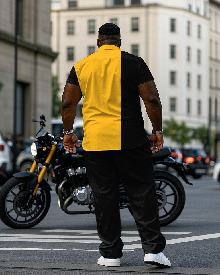 Big & Tall Men's Yellow & Black Color-matching Business Short-sleeved Shirt Pants Suit