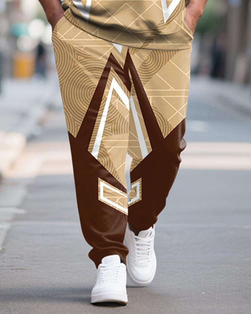 Big & Tall Men's Yellow Brown Geometric Print POLO Collar Zipper Long Sleeve Pants Two-Piece Set