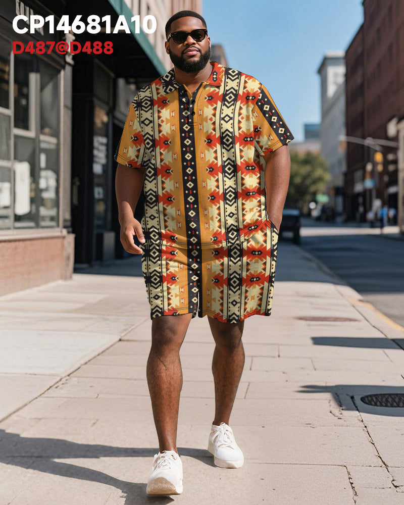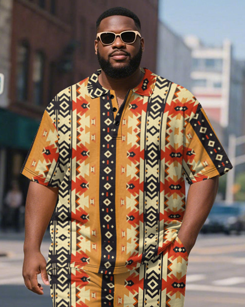 Big & Tall Men's Yellow Geometric Colorblock Diamond Print Short Sleeve Polo Shirt Shorts Suit
