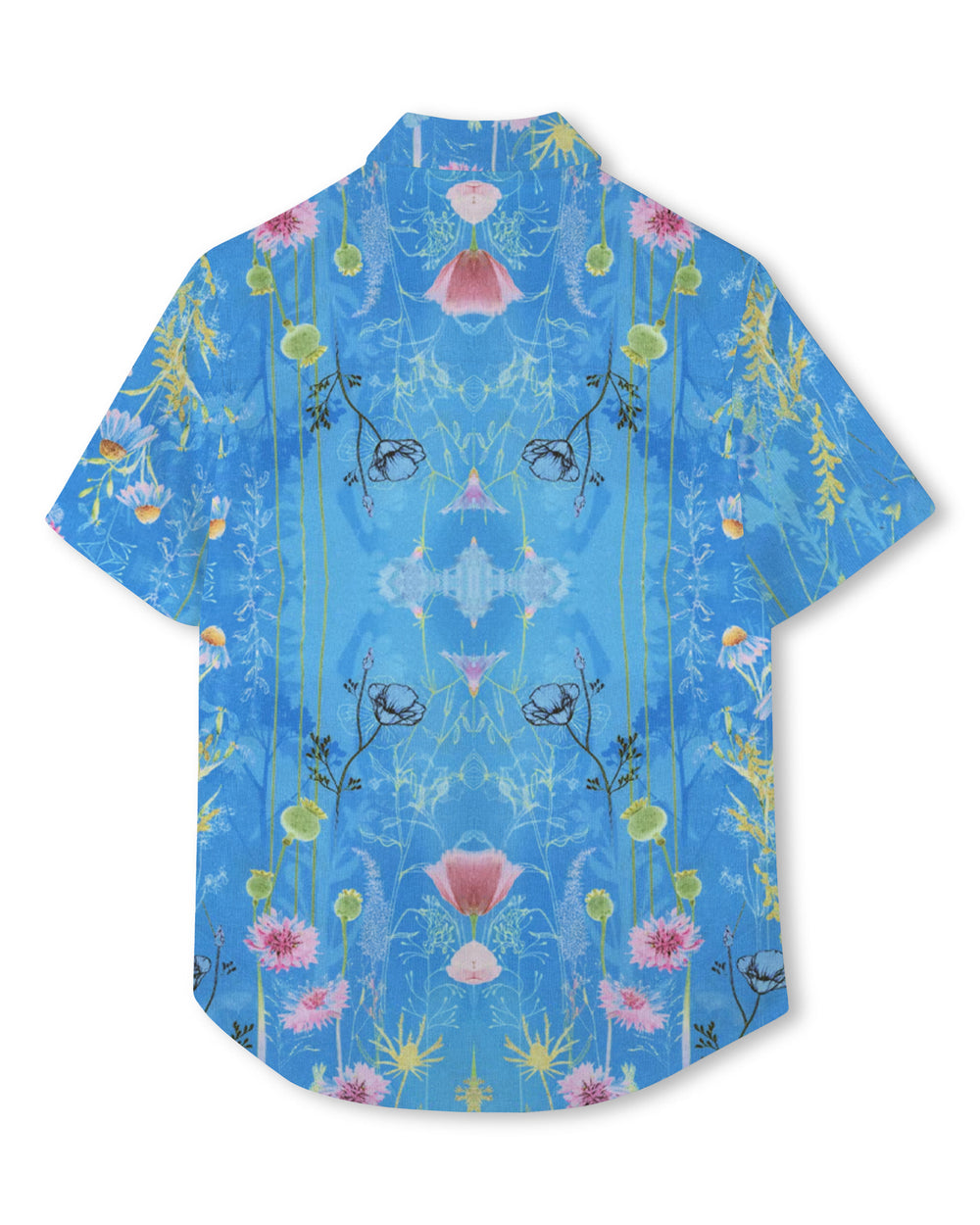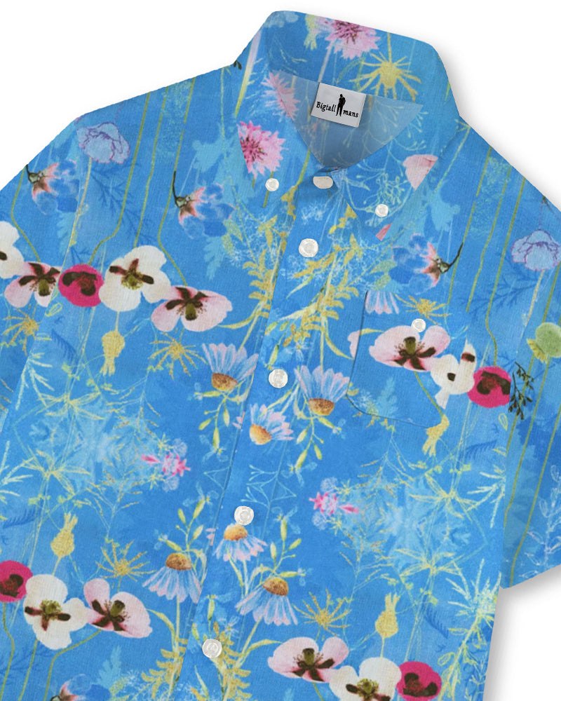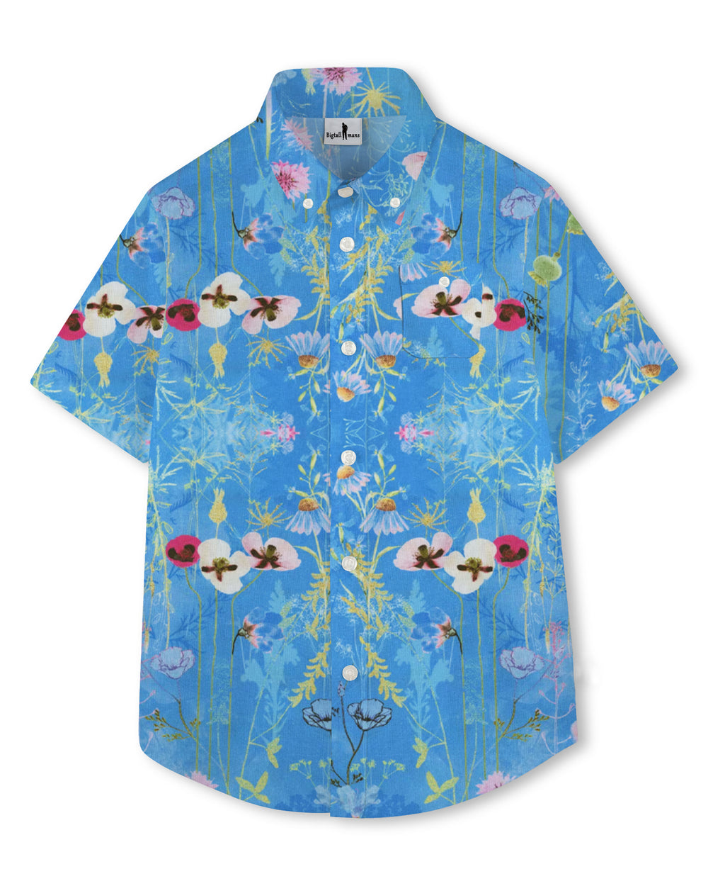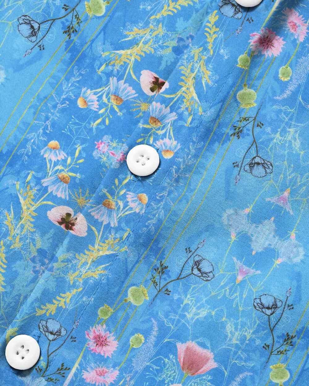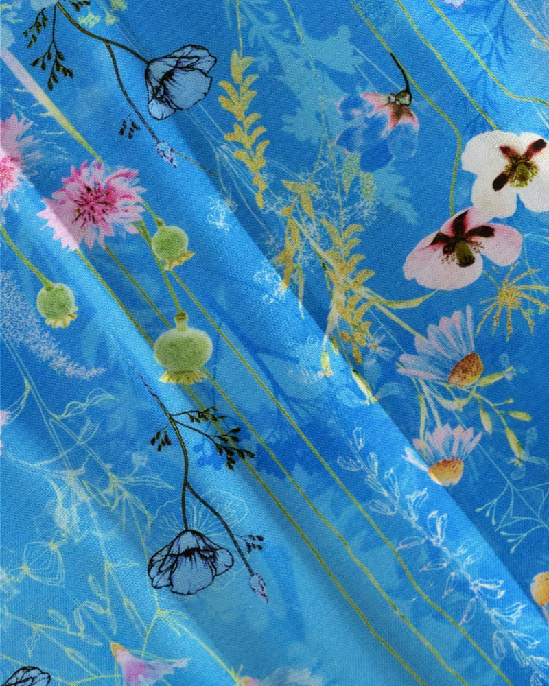 Digital illustration with English wildflowers, their petals forming a series of symmetrical shapes and colors on a blue background. Watercolor delights meet in a soft pastel palette. The design blends light sky blue, medium pink and white, using watercolor techniques to achieve fluidity and depth.