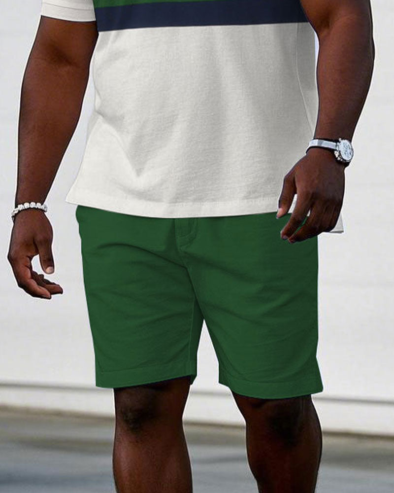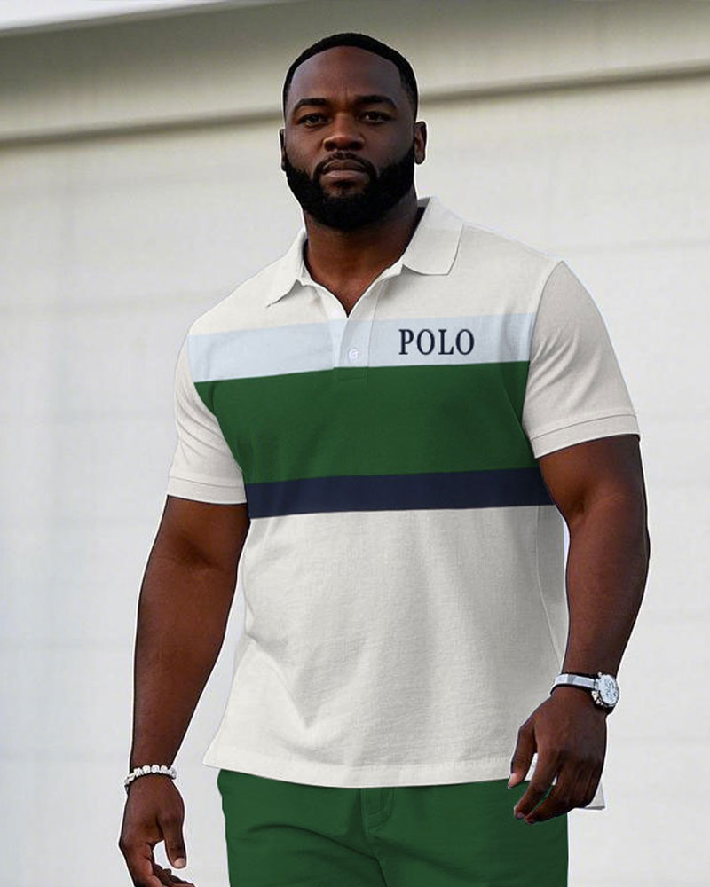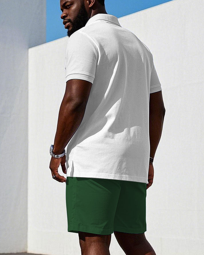 Men's large size Casual Green & White Chest Logo Print Short-sleeved polo shorts set