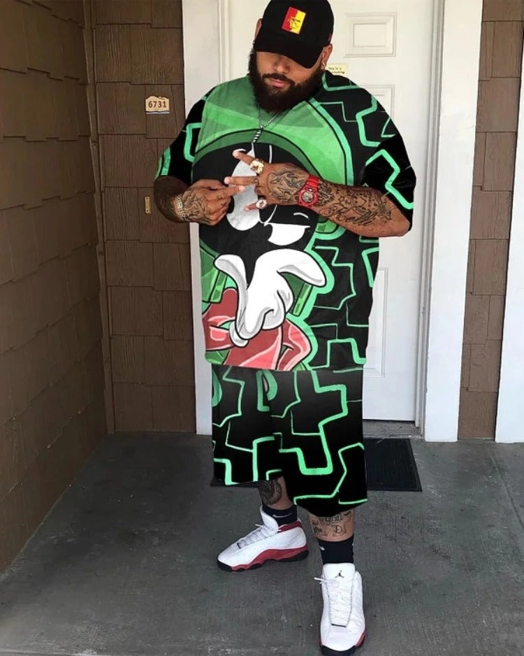 Ready to relive your childhood with a fashionable twist? This black set features playful character prints in vibrant green, bringing fun and nostalgia to your wardrobe. The whimsical designs capture the spirit of youth. It is ideal for you to appreciate a unique take on street style while celebrating your inner child.