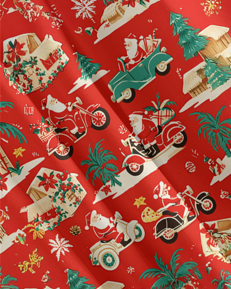 -Vibrant Christmas-themed print featuring a tropical beach backdrop, with Santa Claus, reindeer, and elves at the center. Palm trees and snow-covered grass surround colorful gift boxes and ribbons. People play instruments aboard boats or canoes on the shimmering water. In the background, snow-capped evergreen trees are adorned with festive decorations like string lights and garlands cascading from their branches, creating a vivid and eye-catching pattern.
