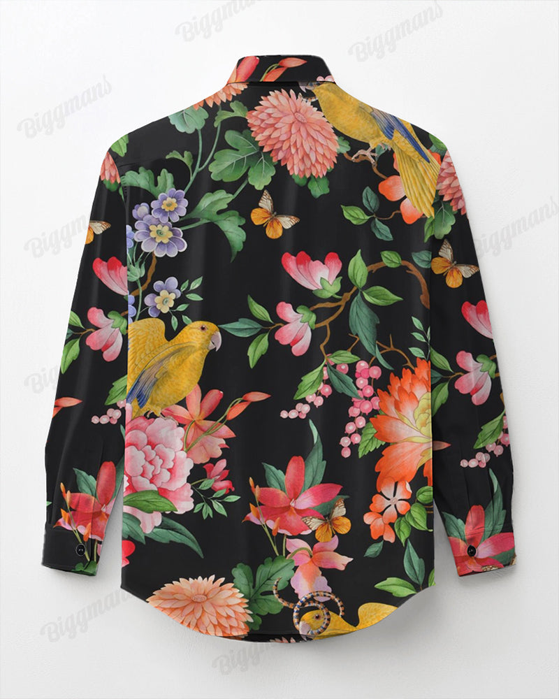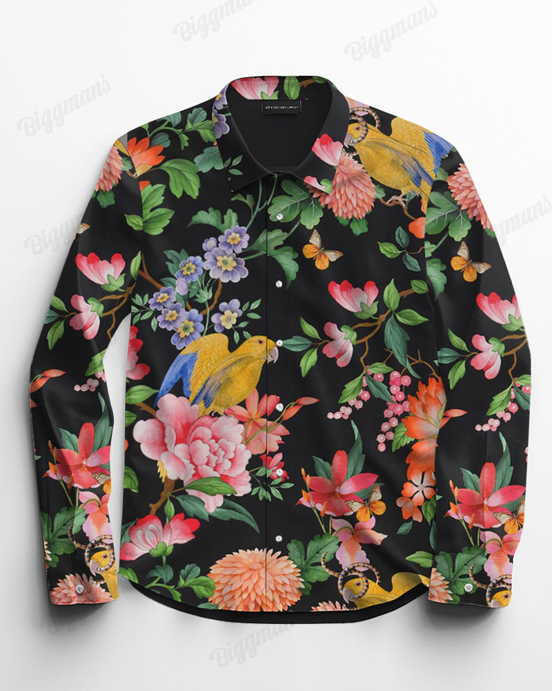 -Long-tailed parakeet with beautiful sunny yellow feathers and blue wingtips perched among bright orange and pink flowers. Butterflies dance among the flower branches. The dark background sets off the vibrant colors and creates the atmosphere of a tropical paradise that will help you escape the grayness of everyday life for just a few hours!
