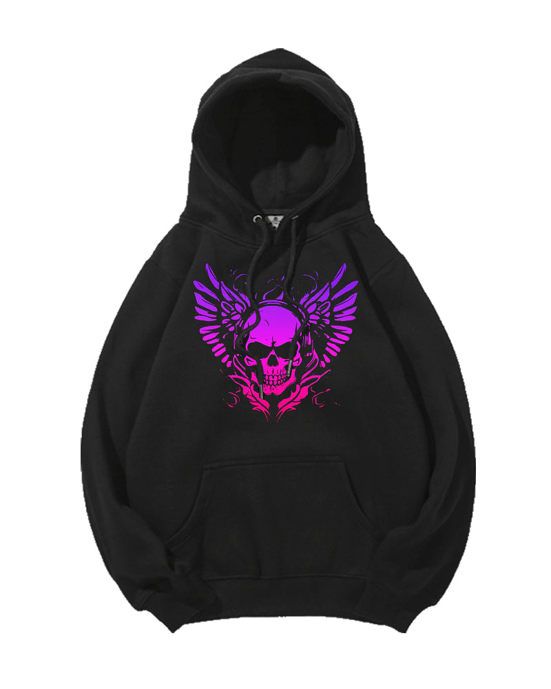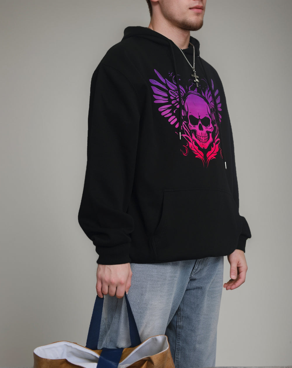 This black hoodie features a striking purple gradient with an angel wing graphic. Crafted from soft cotton, it offers a relaxed fit and was designed in collaboration with DEIOAO. This hoodie combines effortless edge with standout street style. It's perfect for those who want to make a statement.