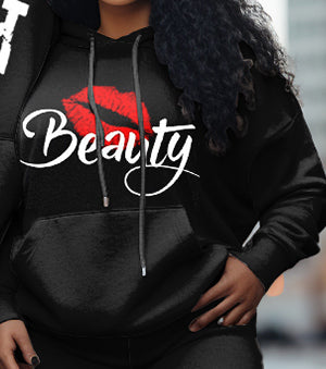 Show off your fierce side with this black ! Featuring bold lip prints and wolf claw marks, alongside "BEAST" and "BEAUT" lettering, it mixes cool and edgy. Designed to stand out, this set brings a fierce attitude to any casual outing in autumn and winter.