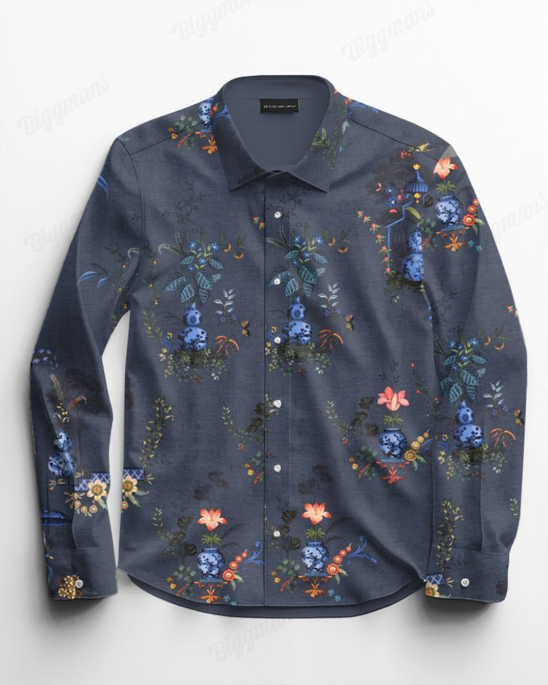 Fashion Jazz Vase Print Long Sleeve Lapel Shirt Men's Plus Size