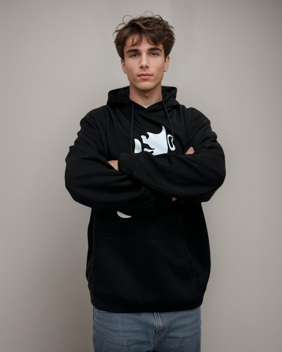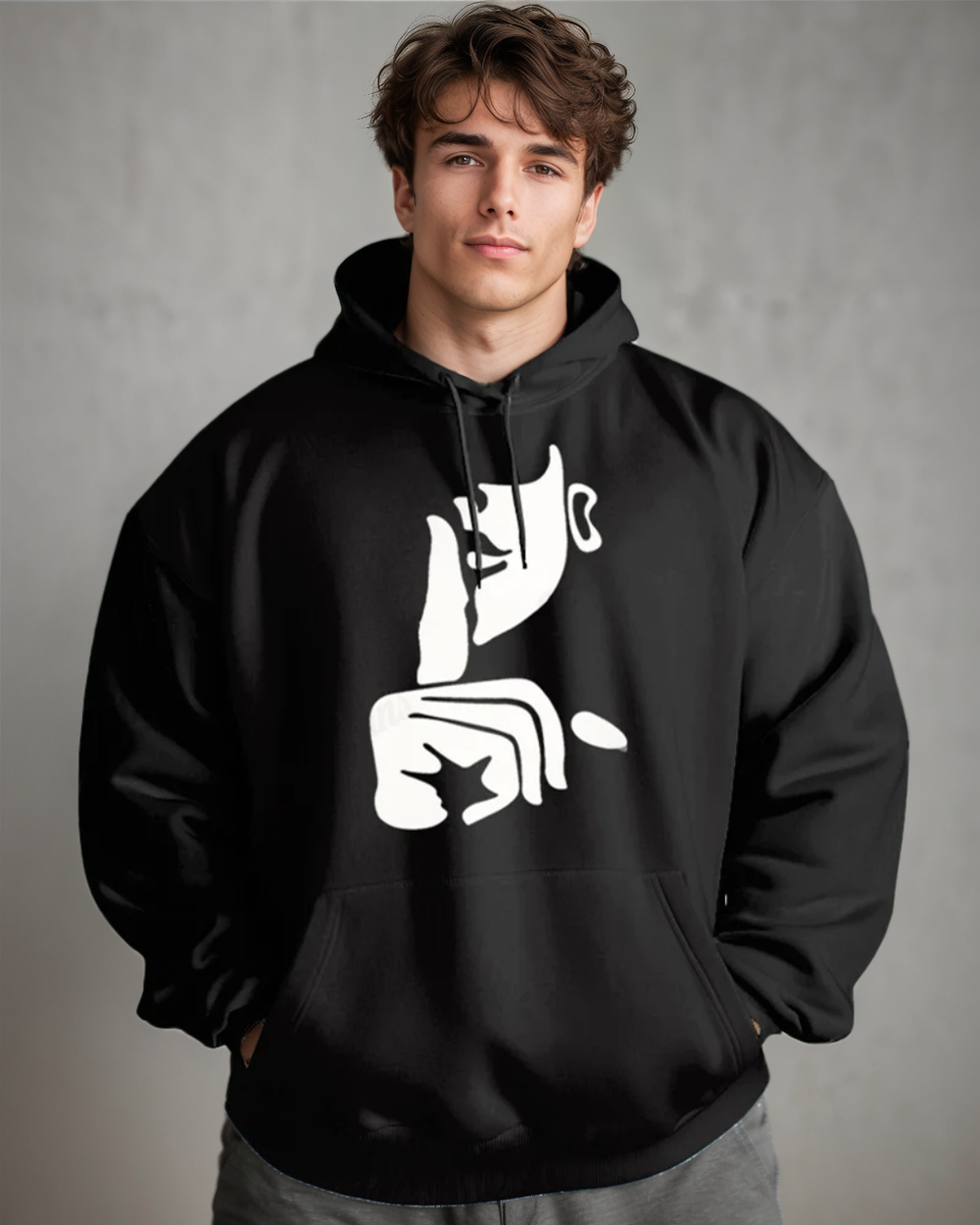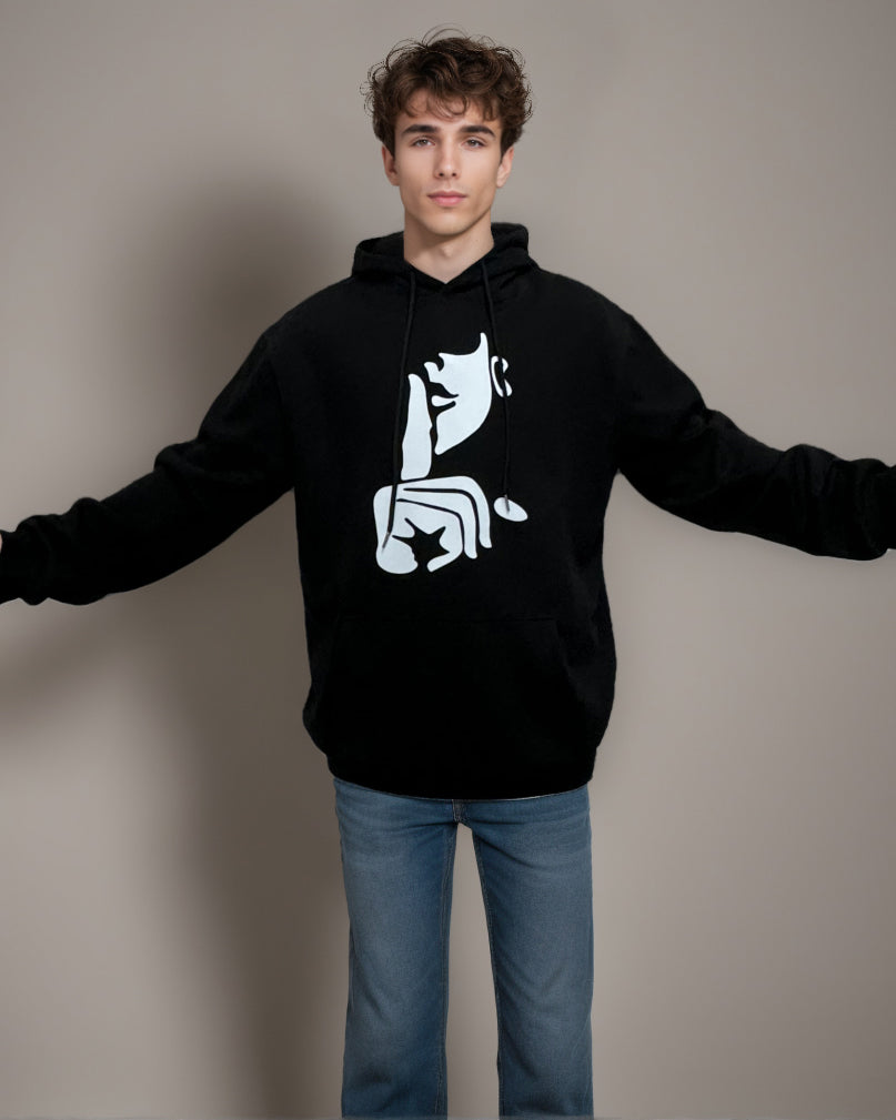This men's hoodie is available in four stylish colors. Its relaxed fit ensures comfort and effortless layering. The standout feature? A cool print of a figure makes the “silence” gesture, adding a simple yet fashionable touch. Made from soft cotton, this hoodie pairs perfectly with any outfit. Isn’t it great how versatile it is? So don’t speak too much, let your style speak!