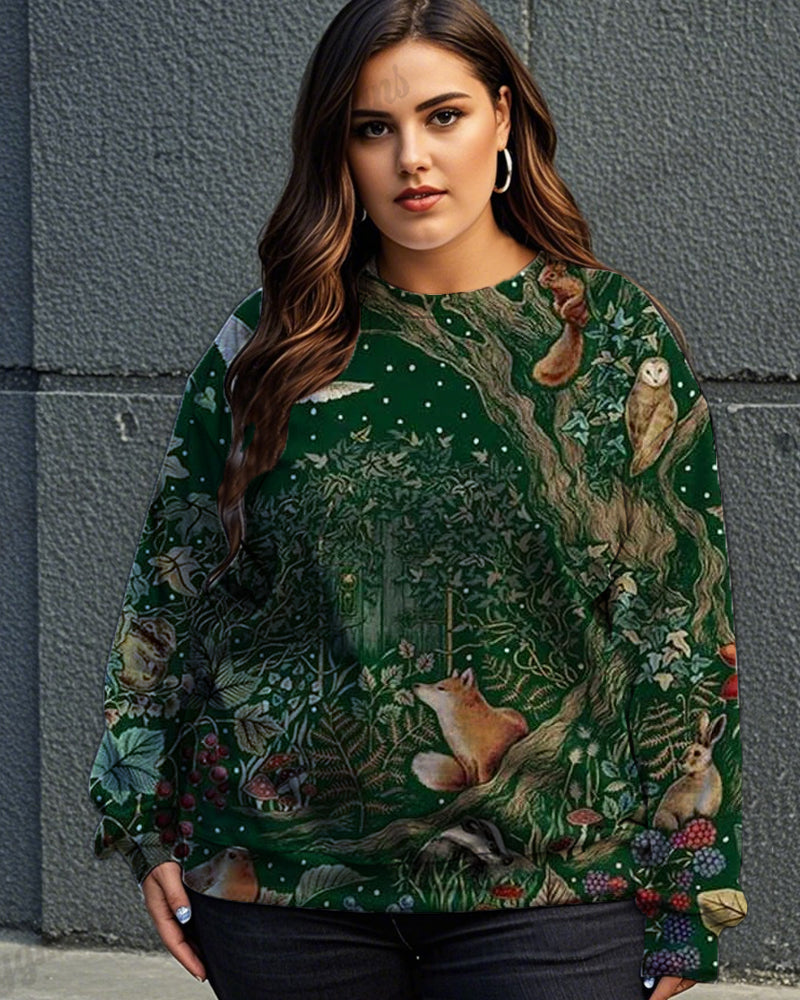 Step into the forest with our enchanting sweatshirt with an elegant green hue and intricate forest-themed print. Designed with cozy material, it's perfect for layering up. This sweatshirt goes beyond aesthetics, offering a warm embrace to all body shapes.