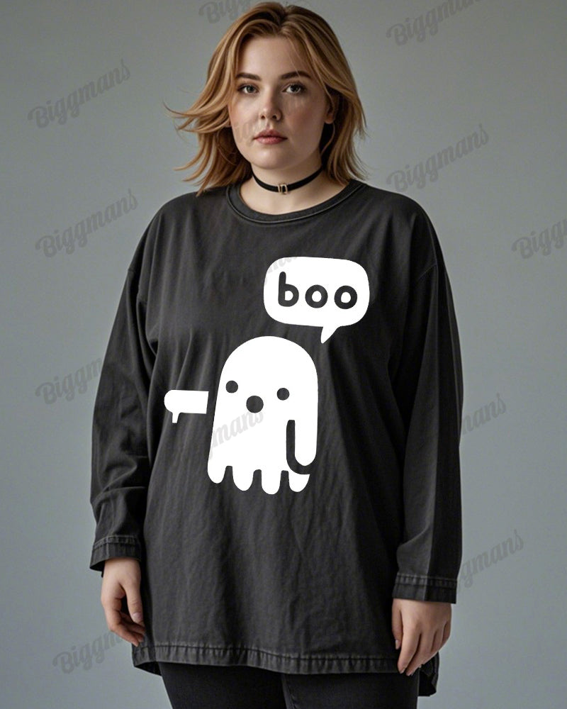 Ghost Boo Print Wash Cotton Round Neck Long Sleeve Plus Size Top
