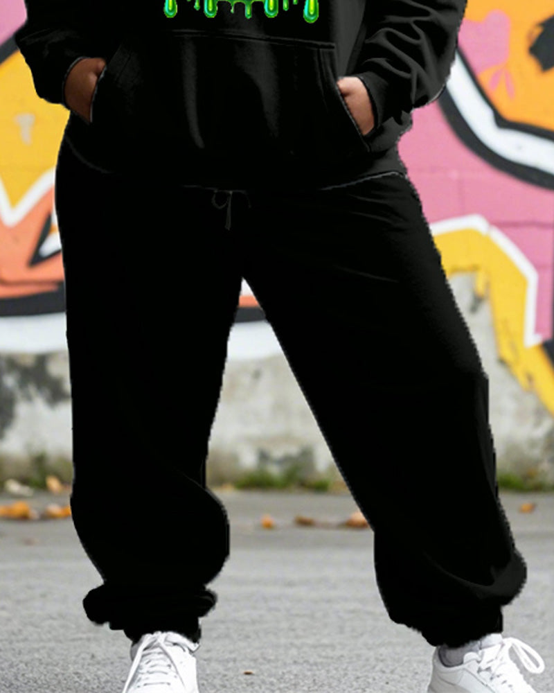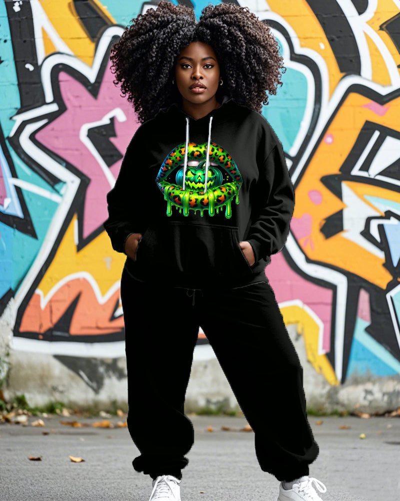 Halloween Personality Lip Print Hoodie Ladies Plus-size Two-piece Set