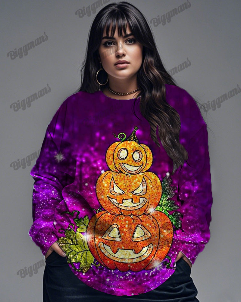 Halloween Pumpkin Sequin Print Plus Size Long Sleeve Top