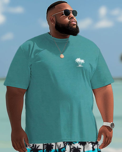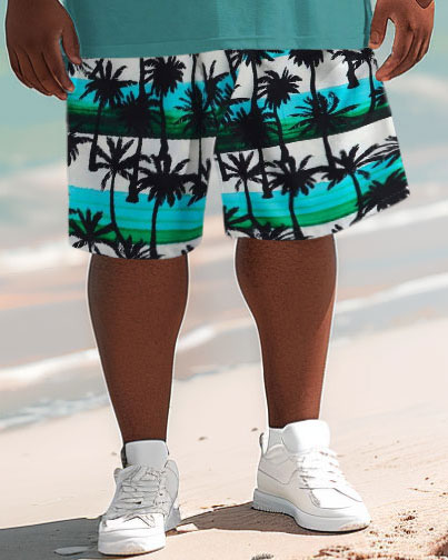 The meeting of simplicity and bustling design in this big guy's set brings visual balance. With coconut tree prints and beach scenery, this set shows a vibrant tropical scene. This loose-fitting set allows for easy movement and maximum comfort, ideal for various occasions.