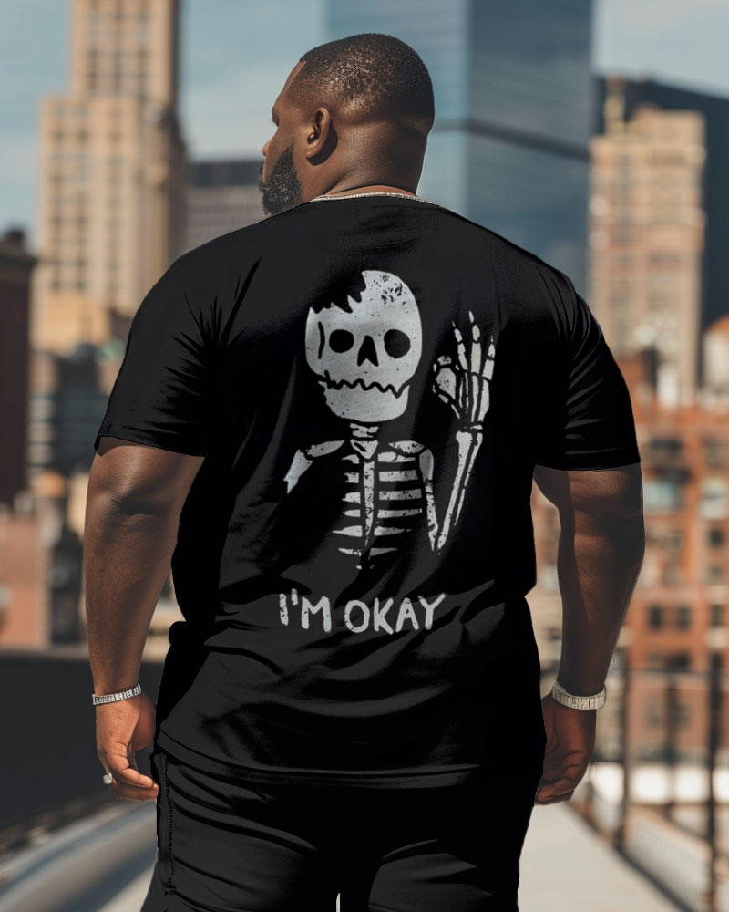 How are you feeling today? This T-shirt tells you the answer. With a bold skull print and "I'm OKAY" lettering on the back, it shows the unique fashion. Its relaxed fit ensures comfort, while the edgy design adds a touch of personality. Perfect for casual wear, this tee blends style and individuality.
