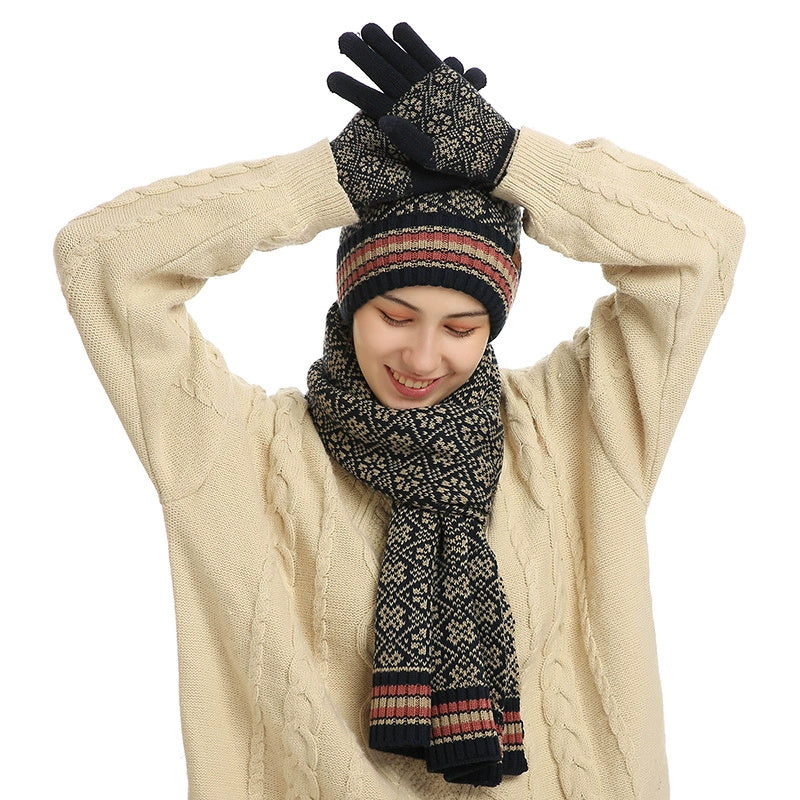 Knitted Retro Pattern Hat Thickened Scarf Touch Screen Gloves Three-piece Set