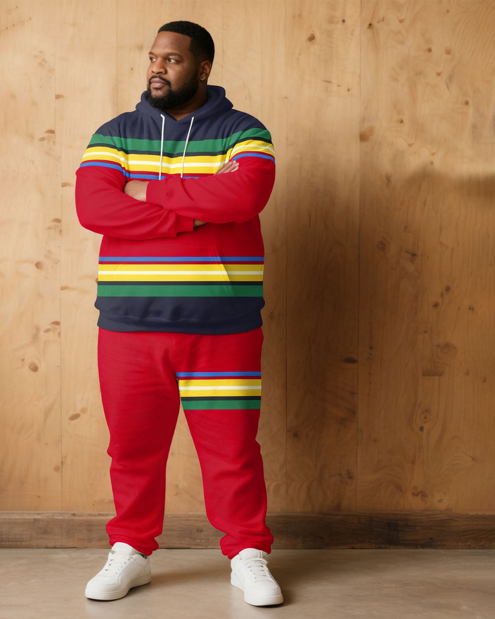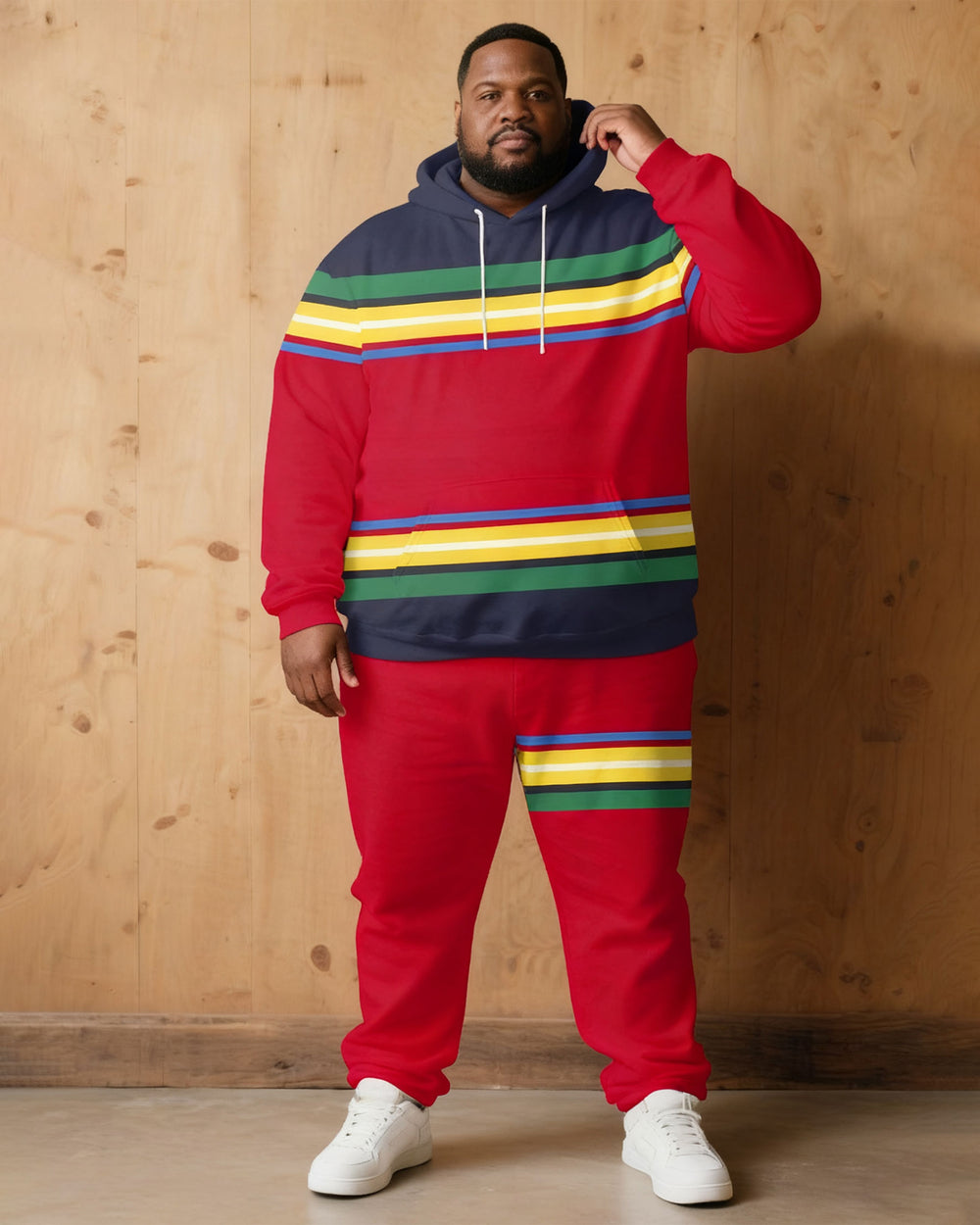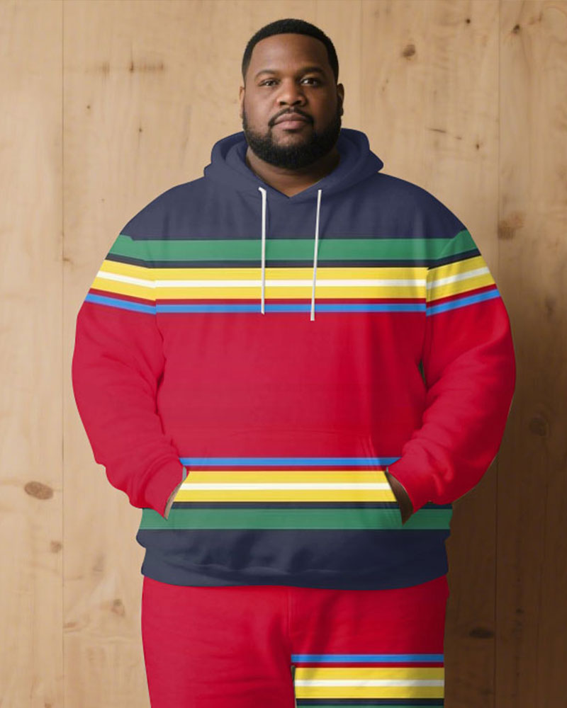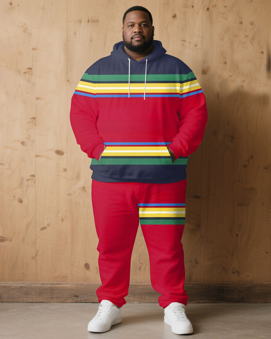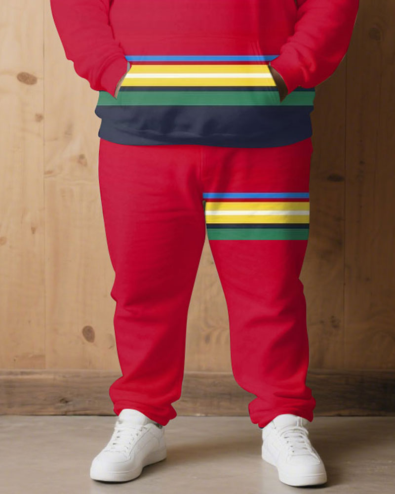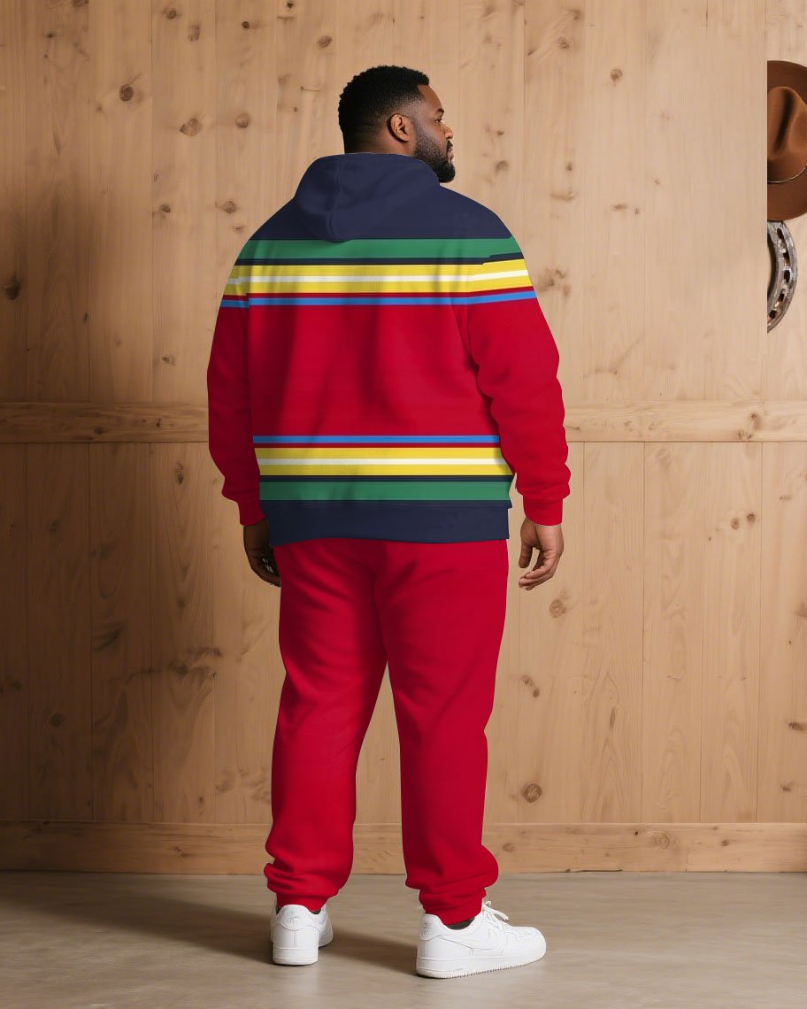 Large Size Men's Autumn And Winter Warm Cold-proof Brown Red & Rainbow Color Contrast Hoodie Sweatpants Set