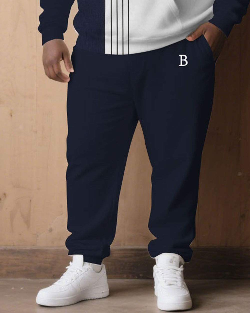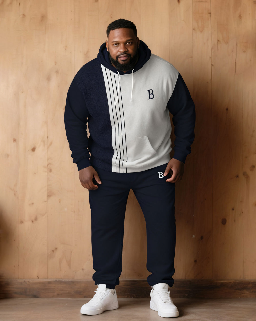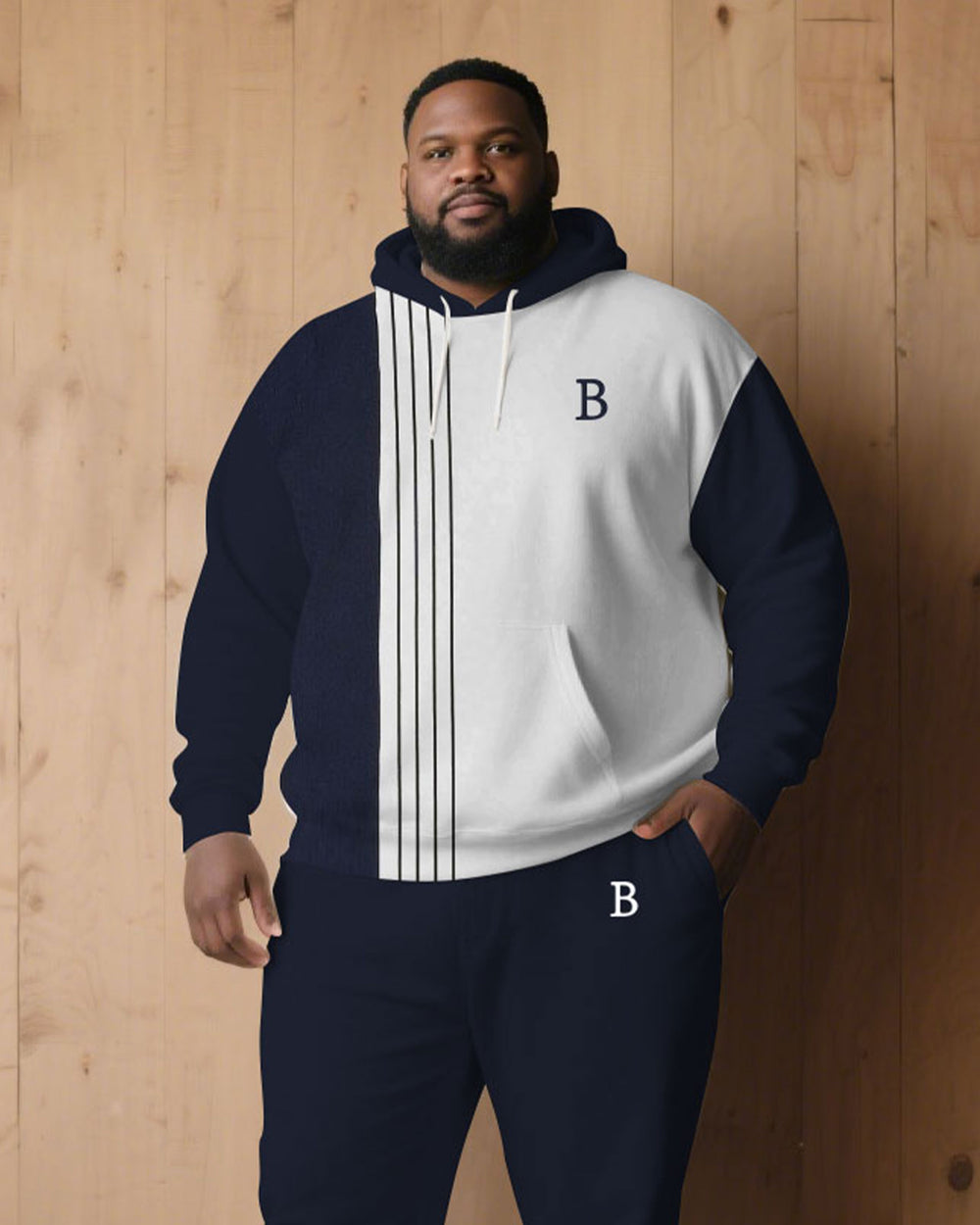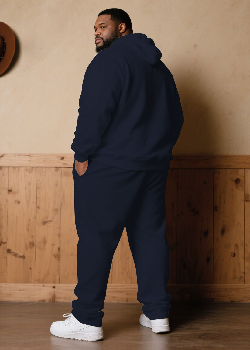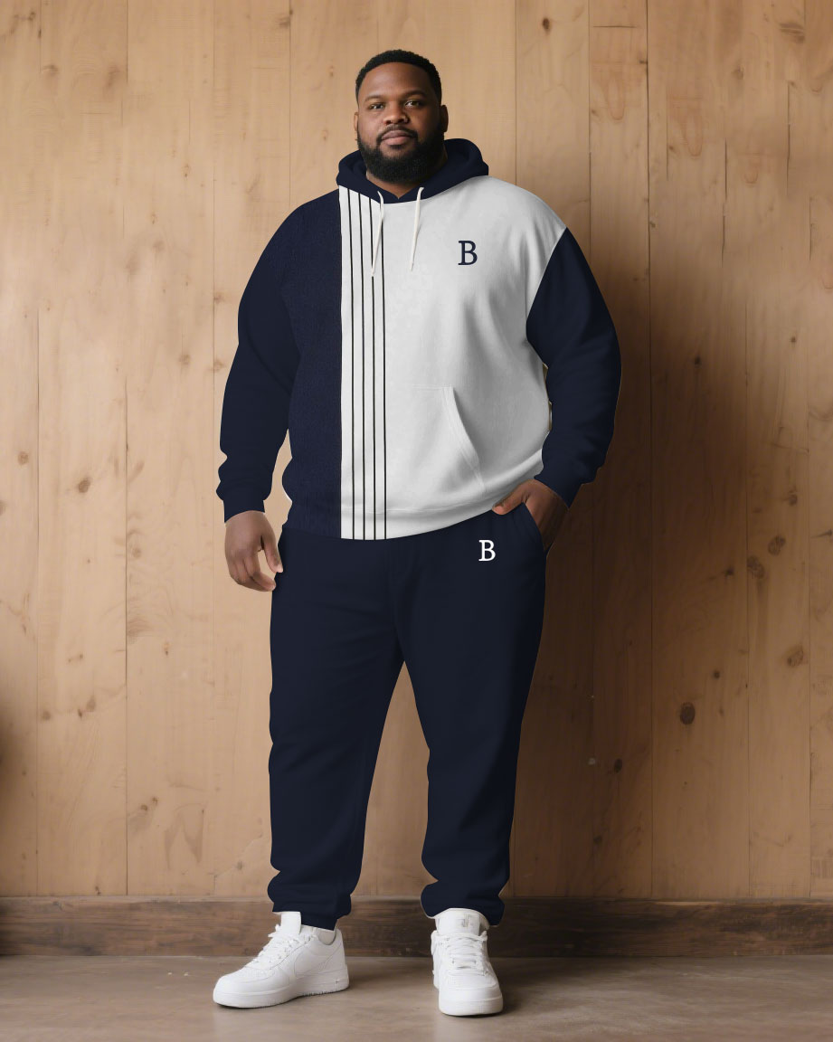 Large Size Men's Autumn And Winter Warm Cold-proof Dark Blue & White Color-block Sleeves Chest Small Label Printed Hoodie Sweatpants Set