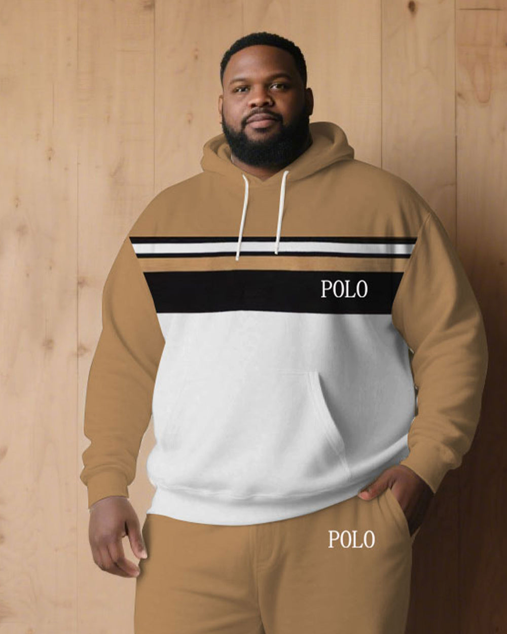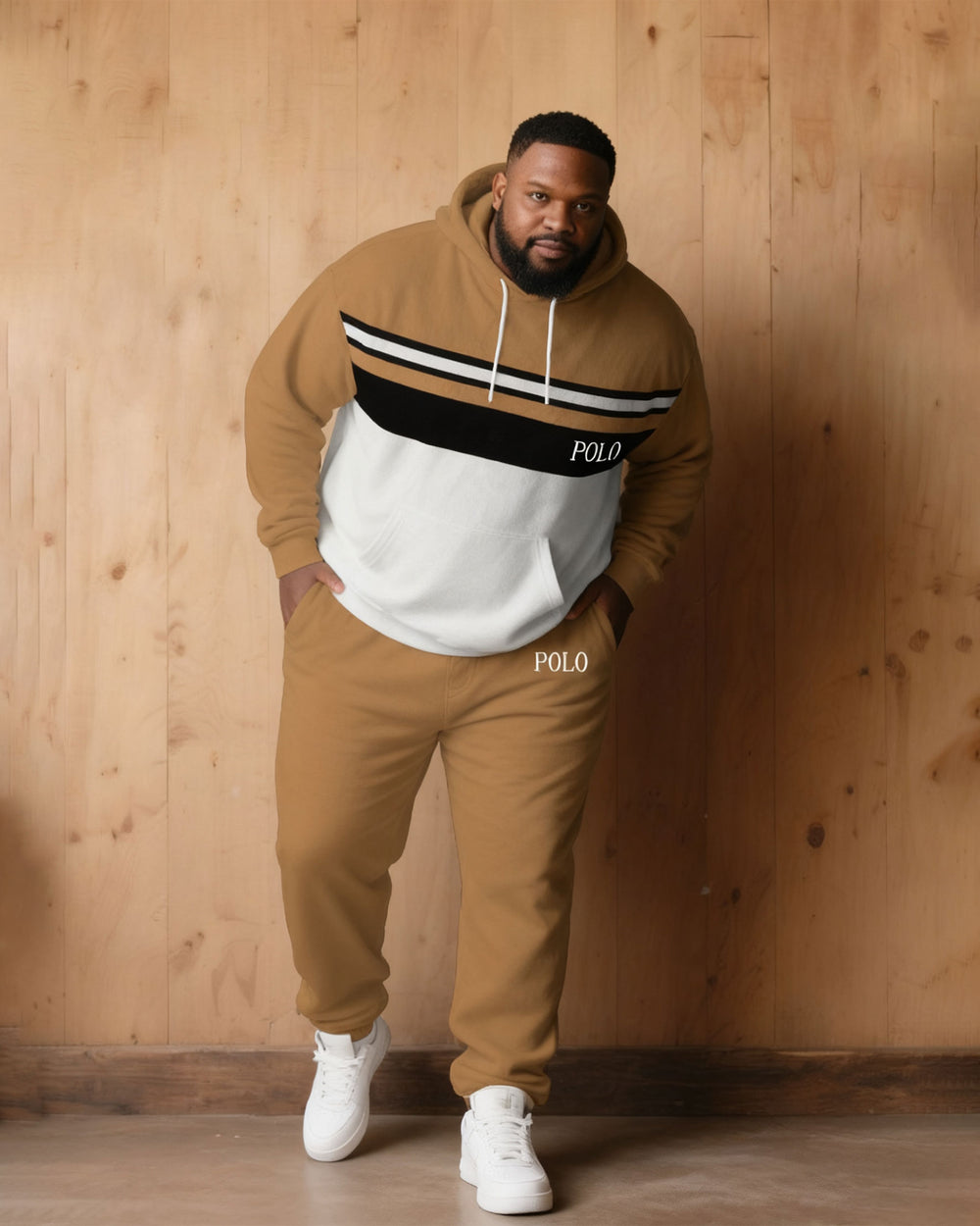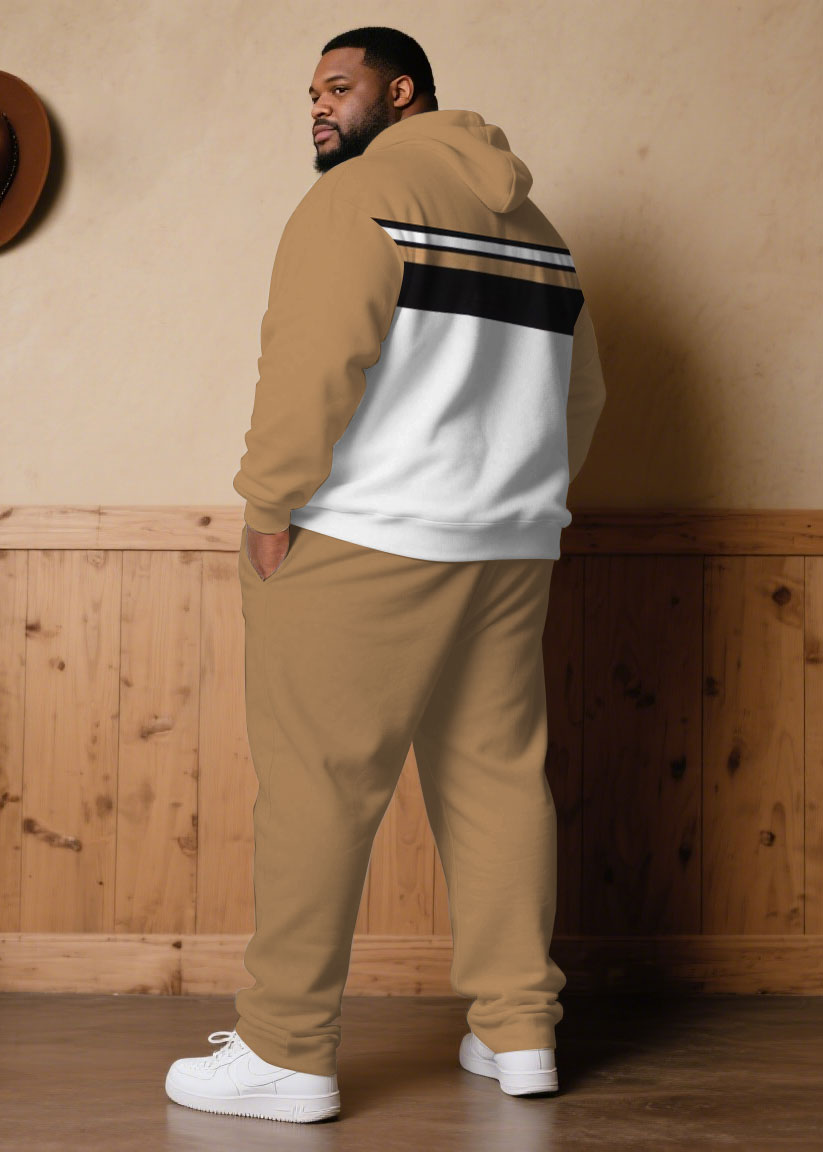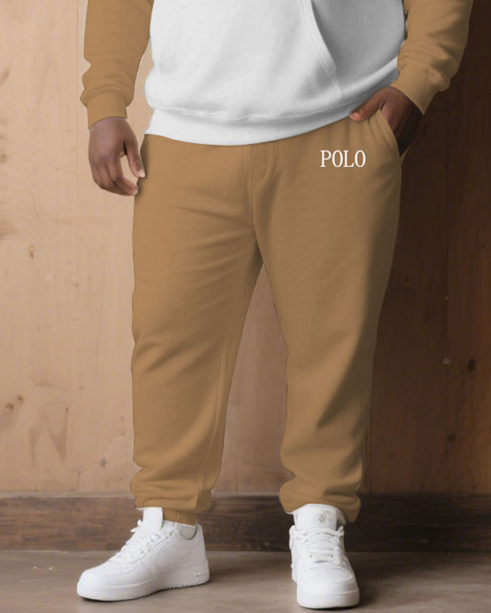Large Size Men's Autumn And Winter Warm Cold-proof Khaki & White & Black Color Sleeves Chest Small Label Printed Hoodie Sweatpants Set