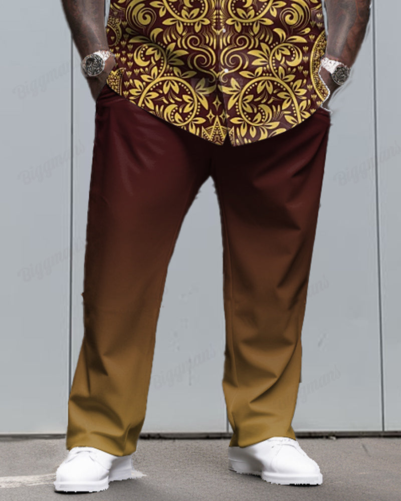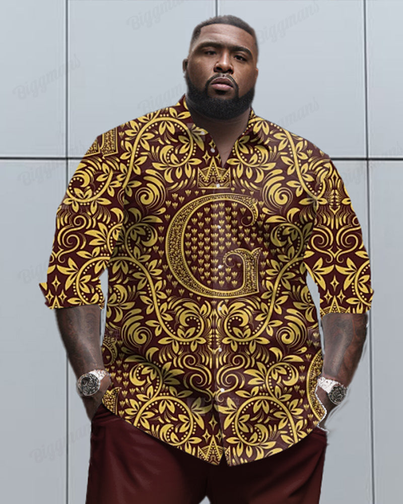 Letter Flower Totem Long Sleeve Lapel Shirt 2 Piece Set Men's Plus Size