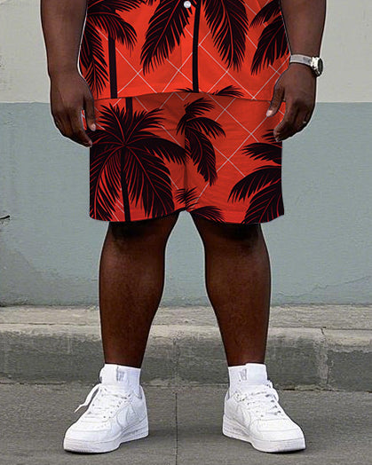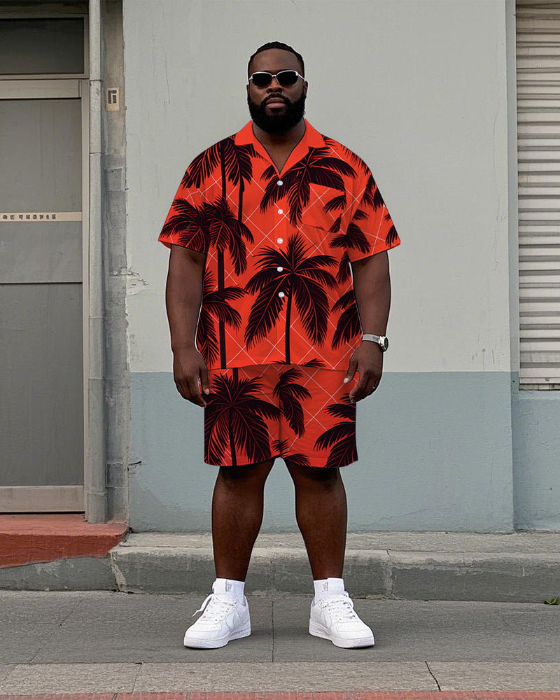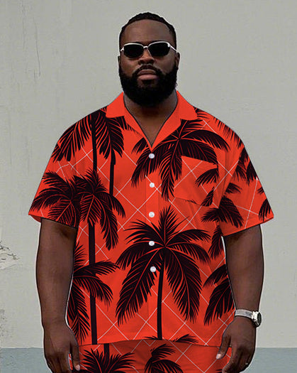 Men's Big and Tall Hawaii Casual Plaid Palm Trees Printed Cuban Collar Short Sleeve Shirt Shorts Set