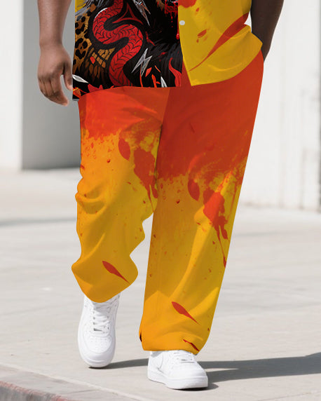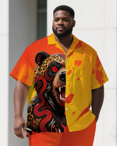 Men's Big Size Cartoon Savage Bear Splicing Style Fashion Short Sleeve Shirt Pants Set
