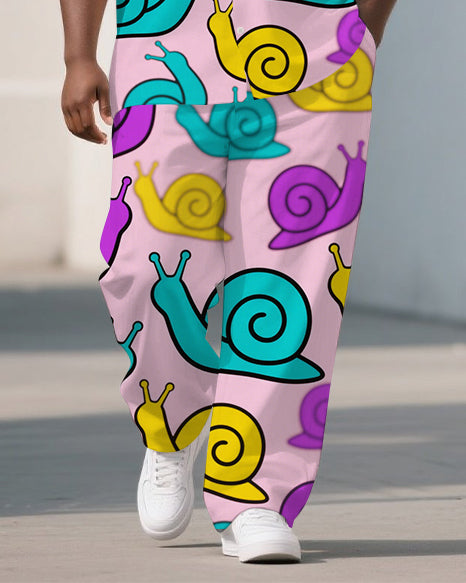 Men's Big Size Casual Cartoon World Snails Printed Streetwear Short-Sleeve Shirt Pants Sets