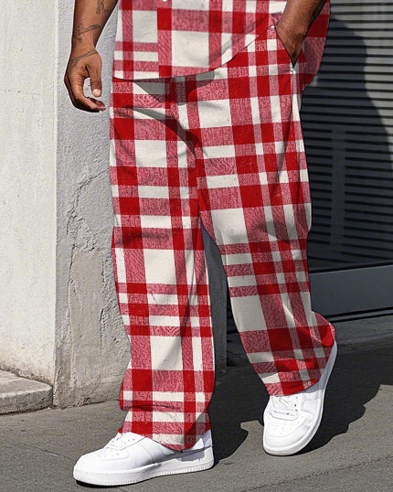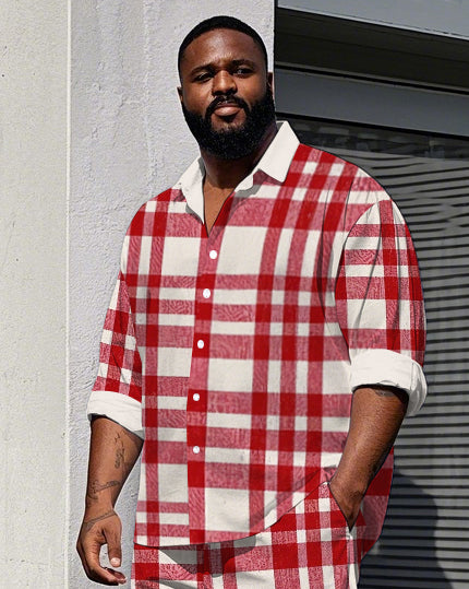 Men's Big Size Daily Casual Classic Simple Red Plaid Printed Long Sleeve Shirt Pants Set