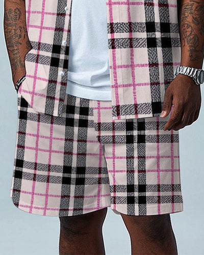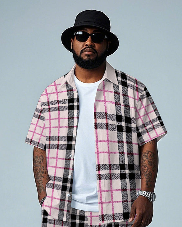 Men's Big Size Gentlemen Pink Plaid Printed Daily Casual Short Sleeve Shirt and Shorts Set