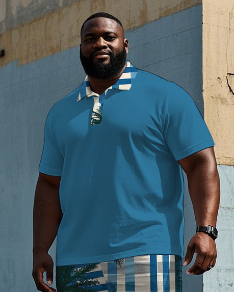 Men's Big Size Hawaiian Coconut Tree Simple Blue Stripe Printed Short Sleeve Polo Shirt Shorts Set