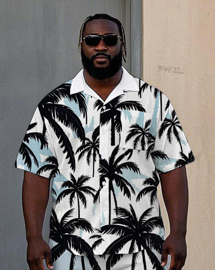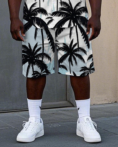 Men's Big Size Hawaiian Fashion Palm Trees Printed Cuban Collar Short Sleeve Shirt Shorts Set