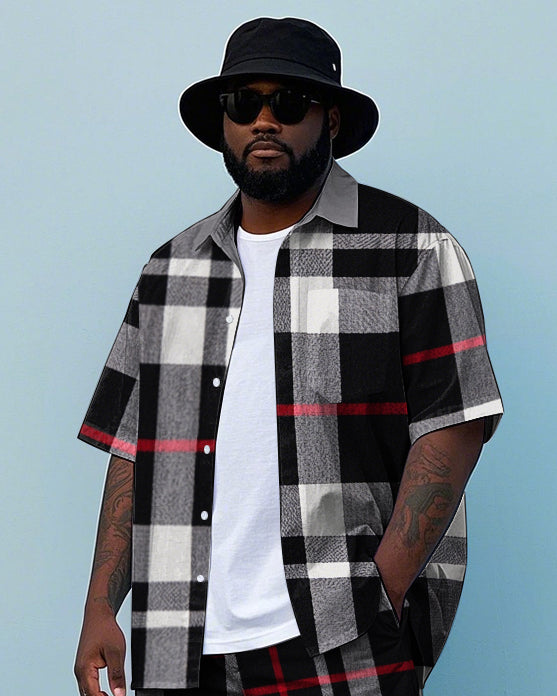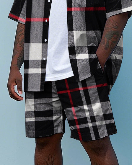 Men's Big Size Simple Classic Black Plaid Printed Daily Casual Short Sleeve Shirt and Shorts Set