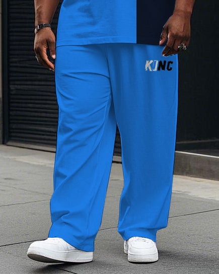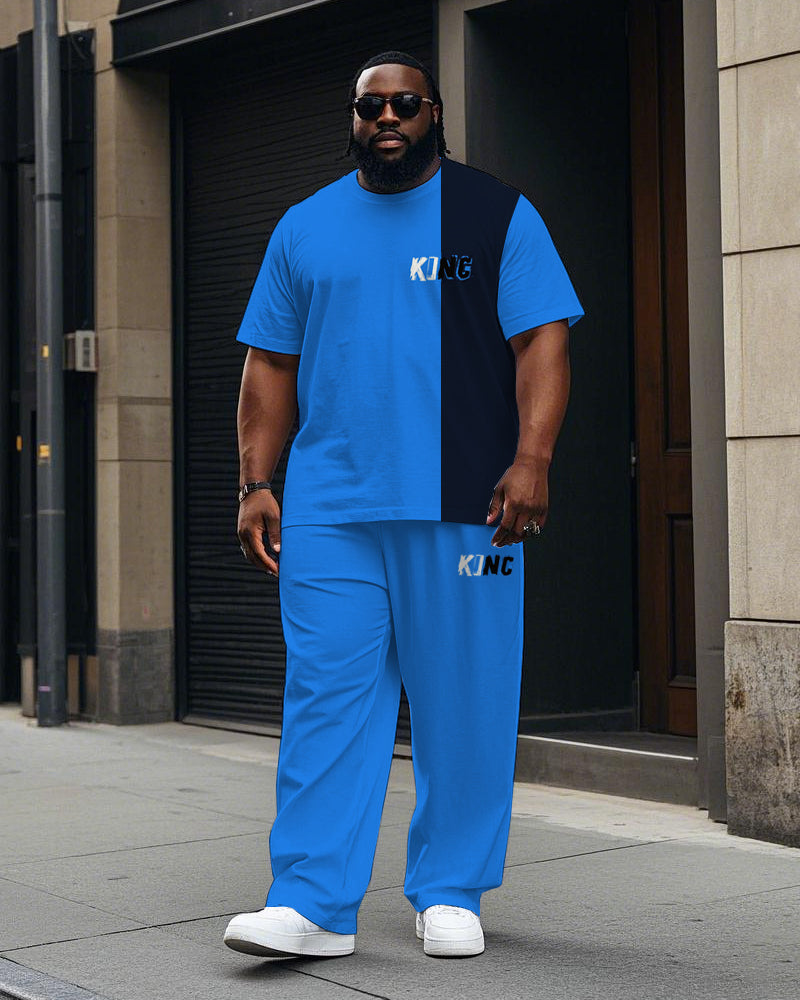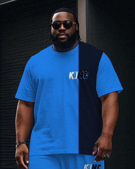 Men's Big Size Splicing Blue & Black Color Block KING Printed Short Sleeve T-shirt Pants Set