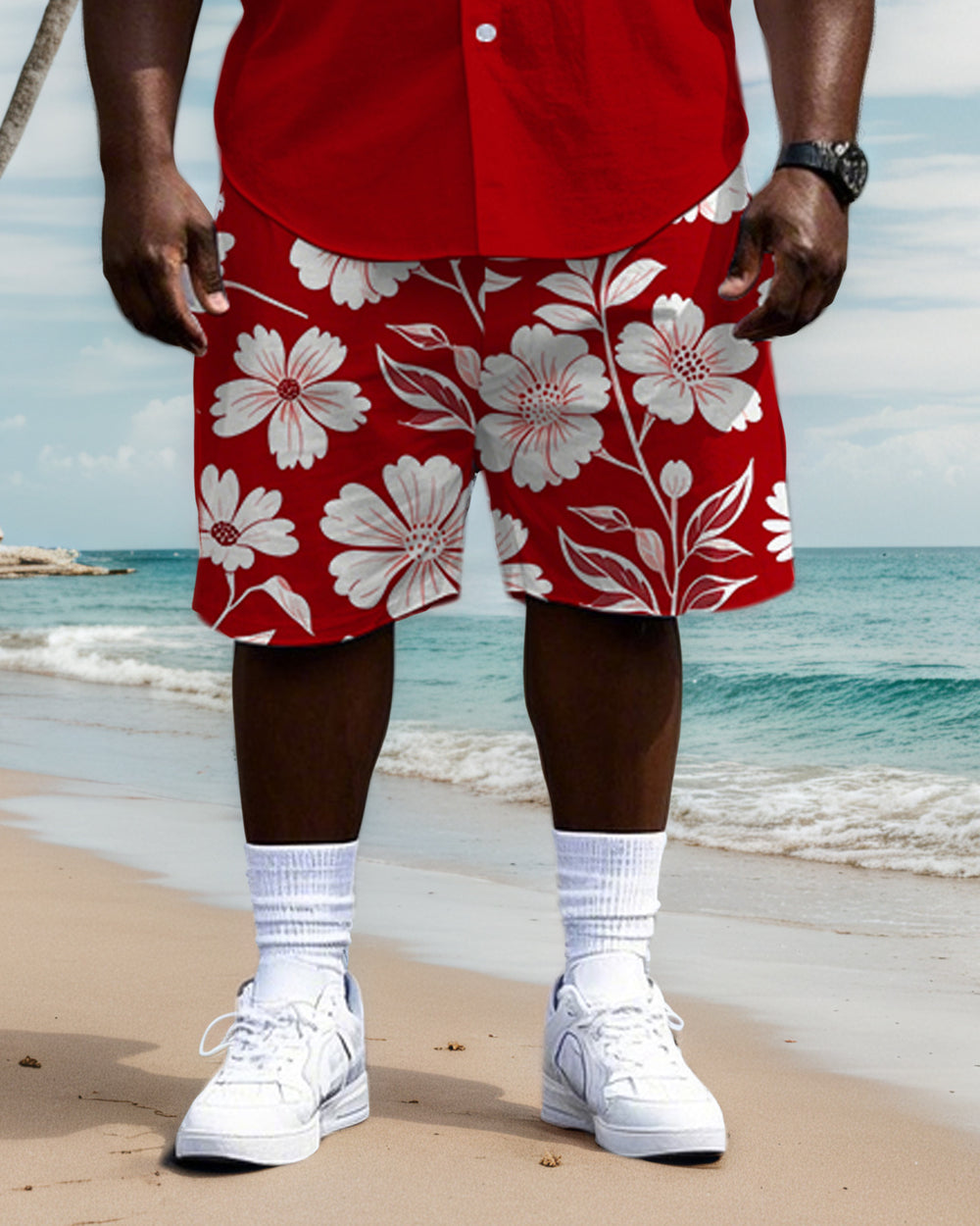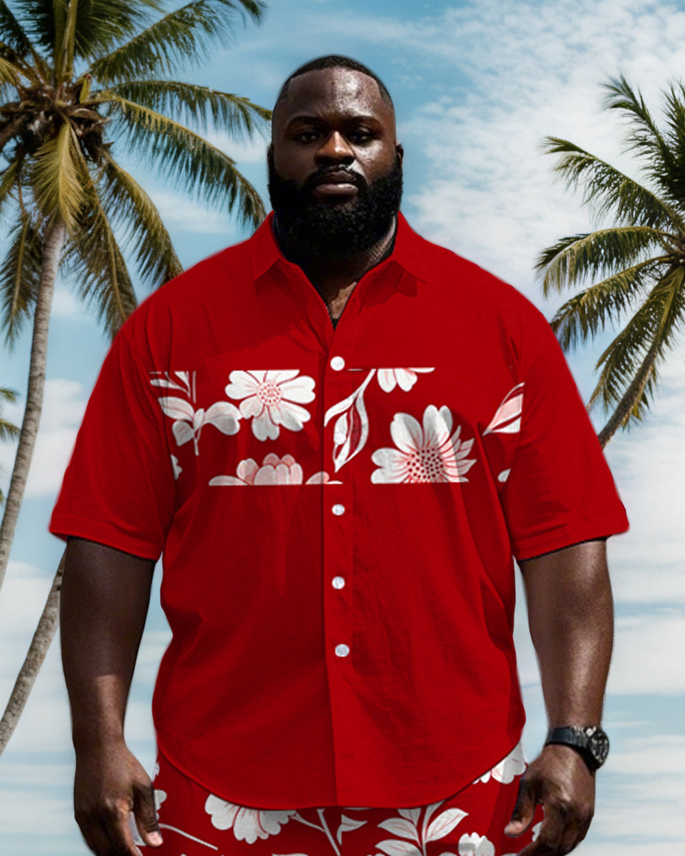 Men's Big & Tall Splicing Wide Stripe Simple Floral Printed Short Sleeve Shirt Shorts Set