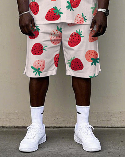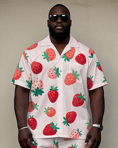 Men's Casual Cute Cartoon Strawberry Printed Big and Tall Cuban Collar Short Sleeve Shirt Shorts Set