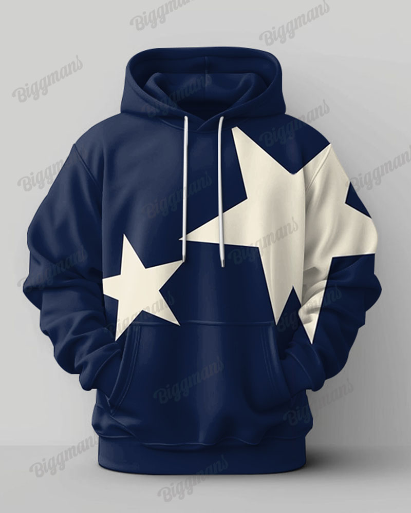 Men's Casual Navy Blue Star Print Plus Size Hoodie Set is all about comfort and style. The navy blue color is calm and atmospheric, and the star print adds a sense of liveliness. The hooded design is practical and trendy, and the plus size is suitable for a variety of body types. The overall cut is sharp, whether it is casual traveling or home wear, can show the unique casual men's style.