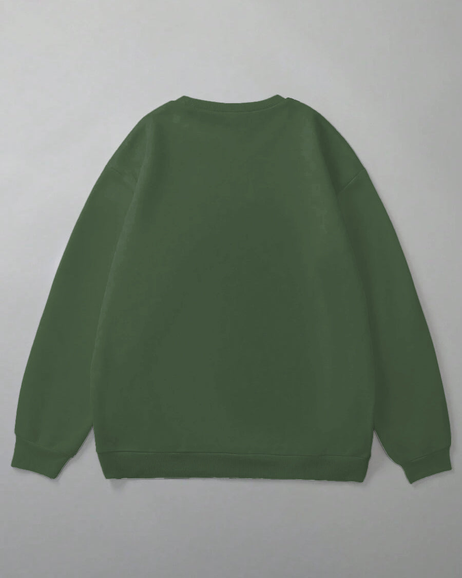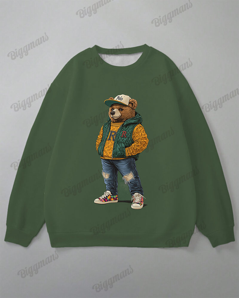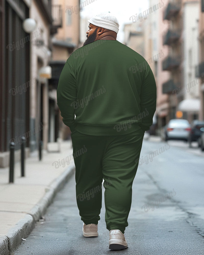 Men's casual sweatshirt set in a predominantly green hue for a vibrant look. The top incorporates graffiti bear and letter print elements, adding a sense of fun and fashion. The plus-size fit makes it comfortable to wear and is suitable for different body shapes. The bottom is coordinated with it, creating a casual and sporty style that is eye-catching.