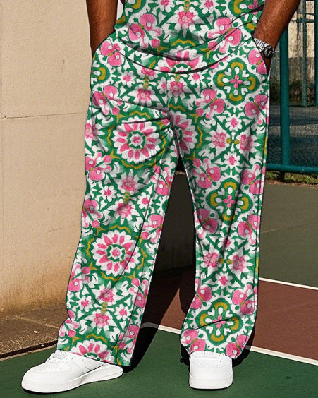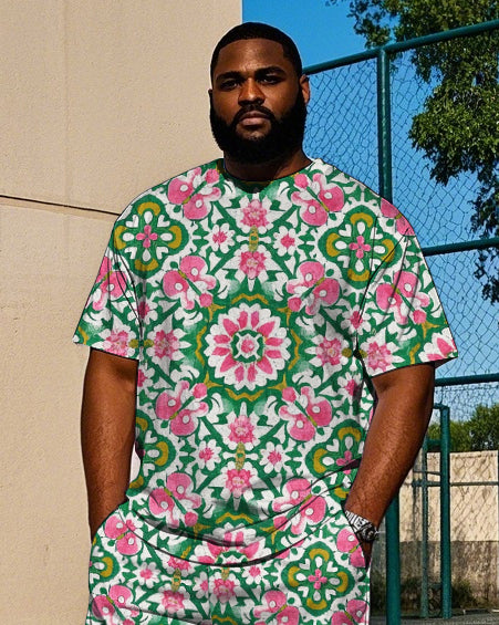 Men's Casual Vintage Floral Folk Printed Big & Tall Short Sleeve T-shirt Pants 2-piece Set