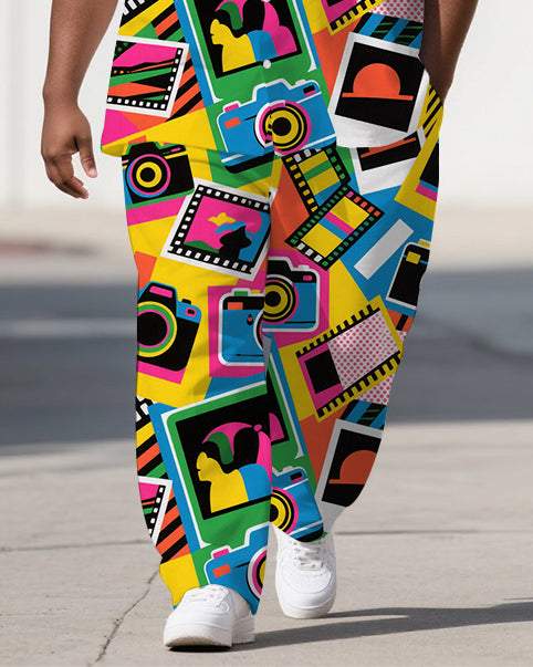 Men's Colorful Cartoon World Camera Printed Big & Tall Short-Sleeve Shirt Pants 2-Piece Sets