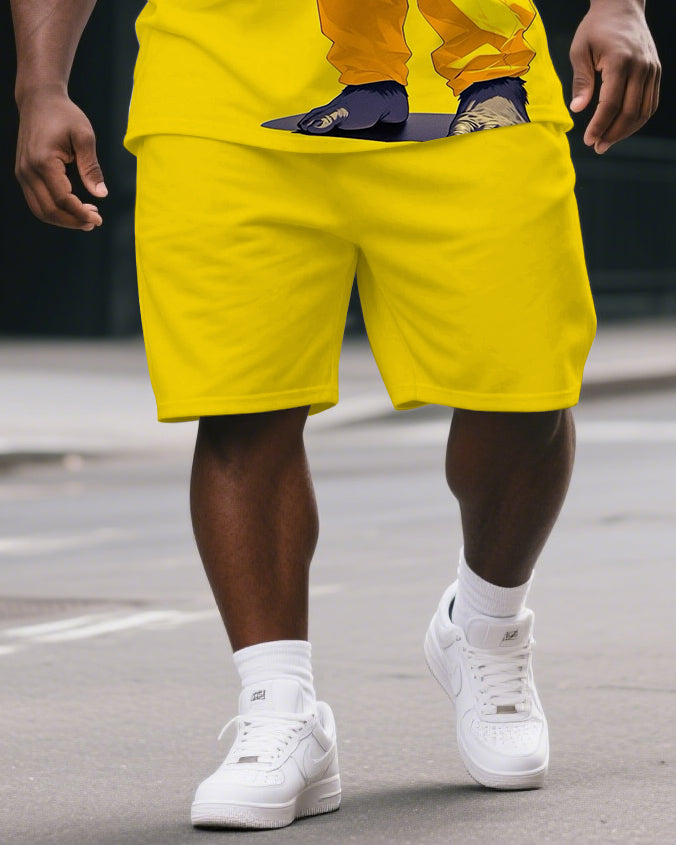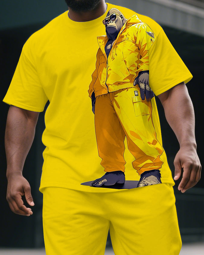 Men's Fashion Yellow Cool Gorillas Cartoon Print Big & Tall Laid-back Short-Sleeve T-shirt & Short Set