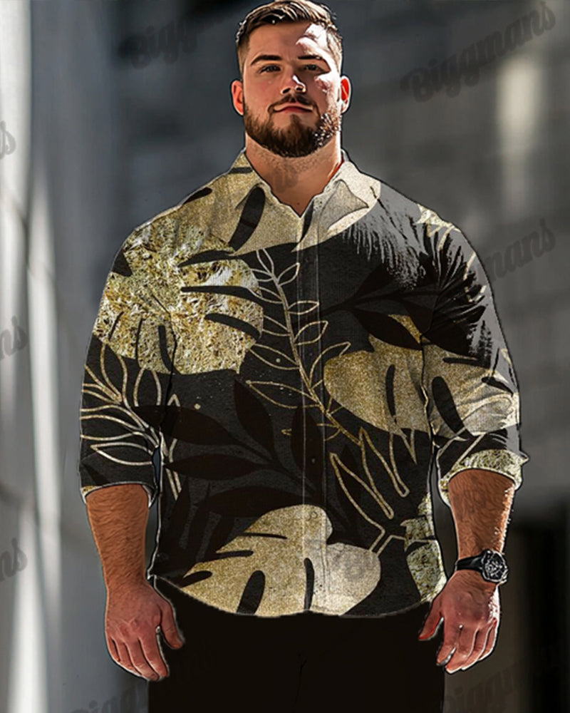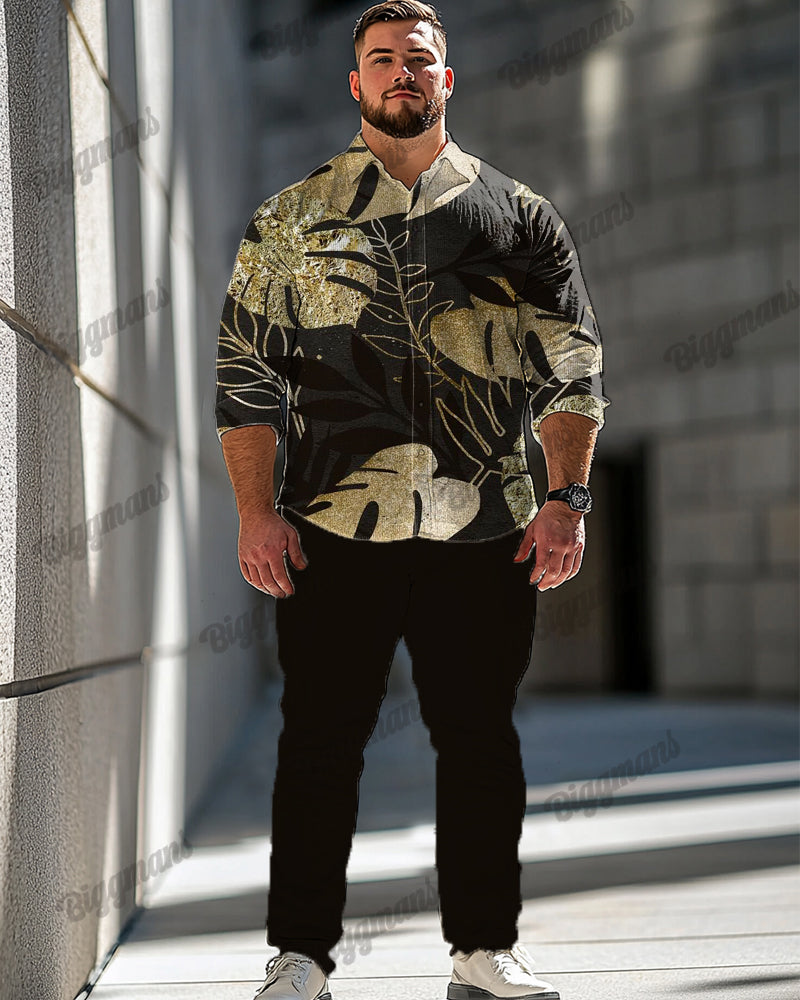 Men's Gold Leaf Printed Large Size Long-sleeved Shirt Set