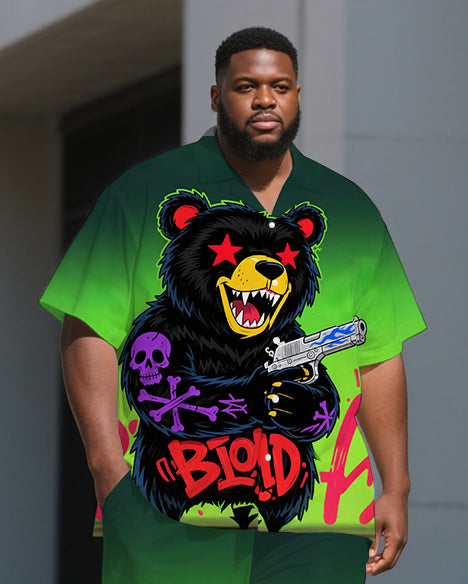 Men's Hip Hop Bear Cartoon Gradient Effect Casual Short Sleeve Shirt and Pants Set
