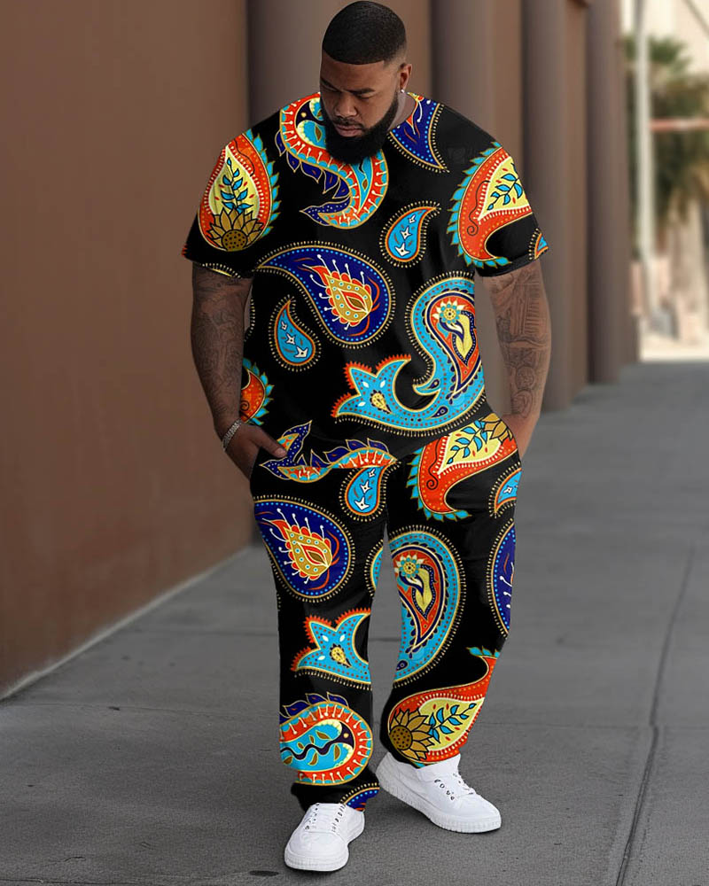 Men's Large Cashew Flower Print T-Shirt Pants Suit