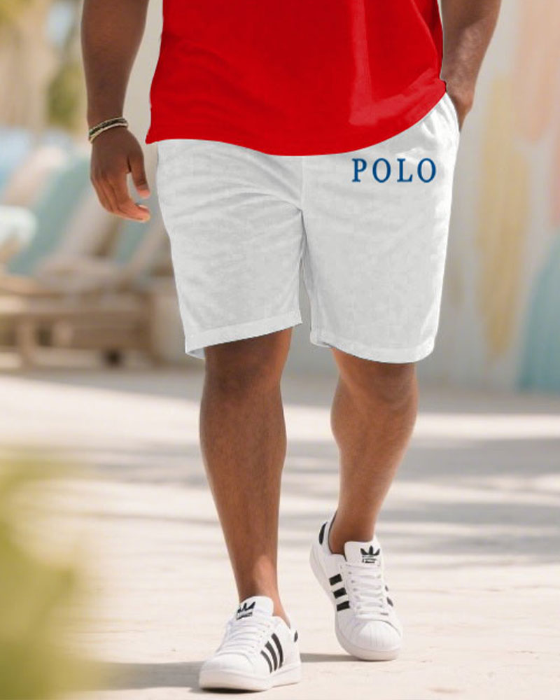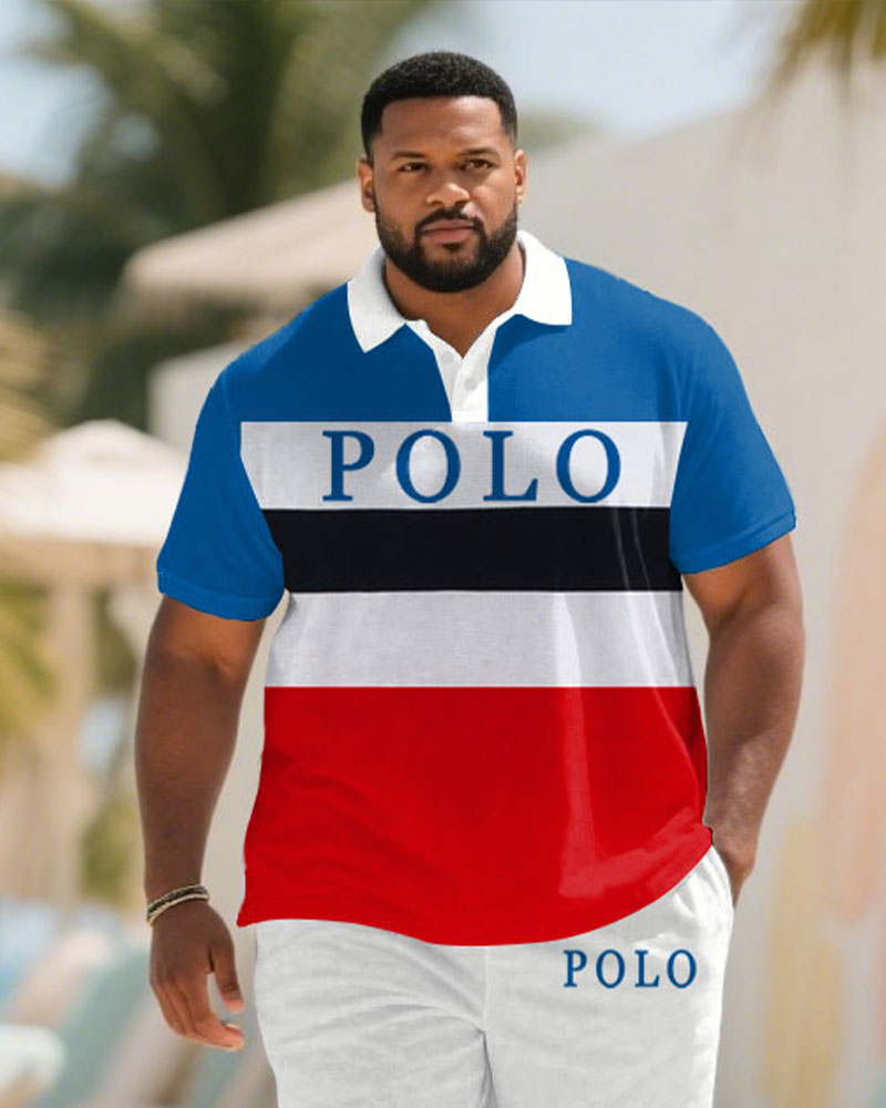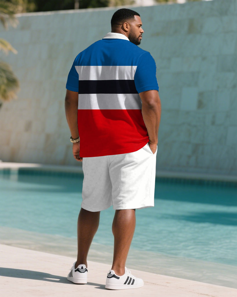 Men's large size Blue & Red & White & Black Patchwork Chest Logo Print Short-sleeved polo shorts set