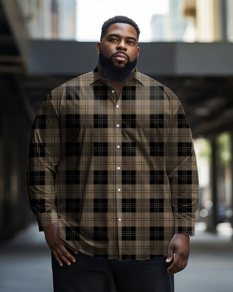 Men's Large Size Business Casual Brown Plaid Lapel Long Sleeve Shirt