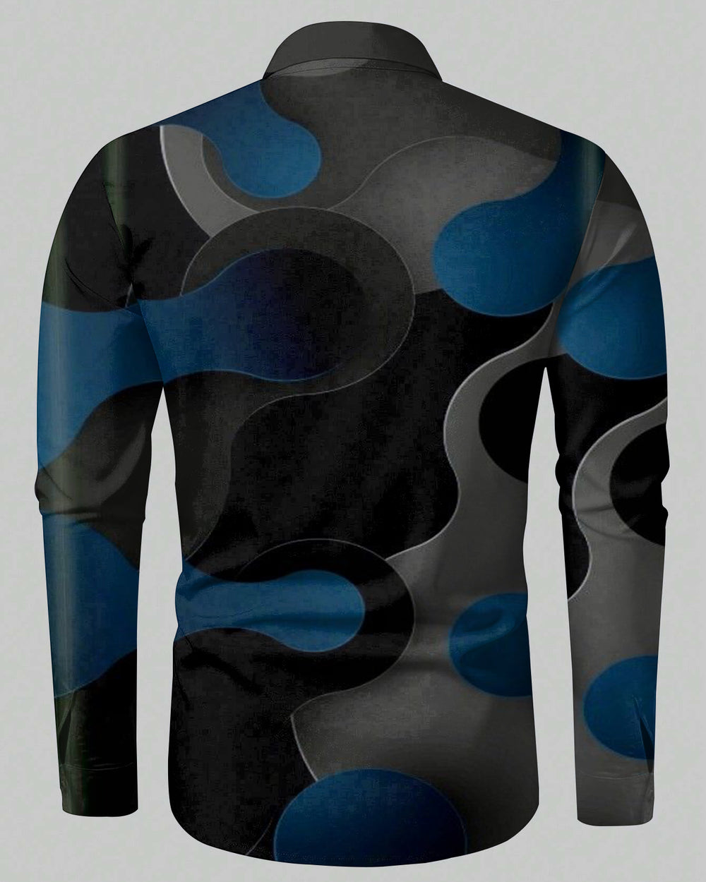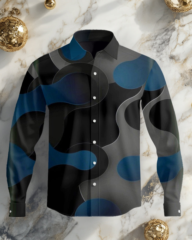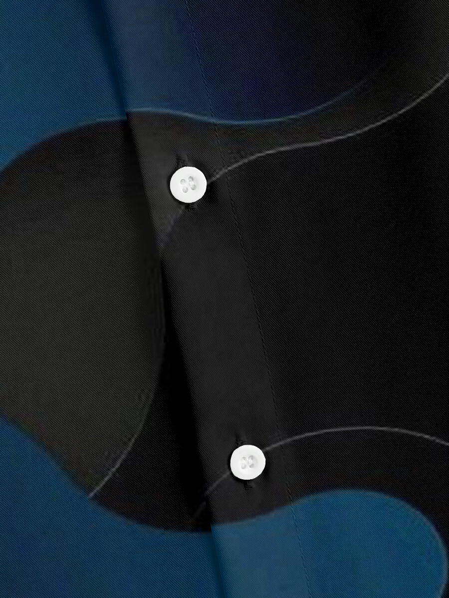 This big men's shirt blends business style with modern fashion. The black base is complemented by gray-blue prints. Its relaxed fit offers comfort and elegance, making it suitable for various occasions. With its versatile design and timeless appeal, this shirt expresses effortless charm.