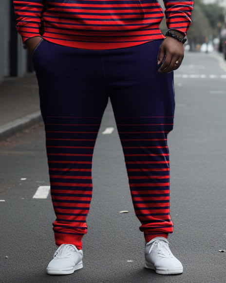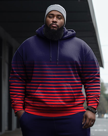 Men's Large Size Horizontal Line Color Block Casual Hoodie And Sweatpants Two-Piece Set