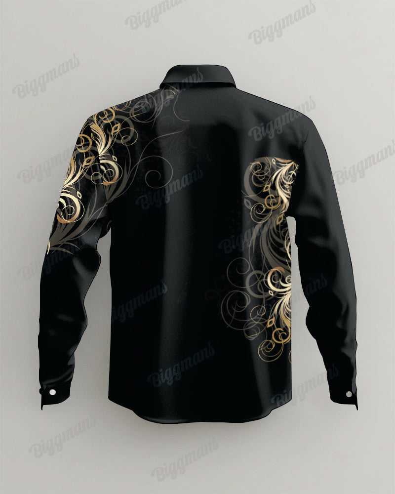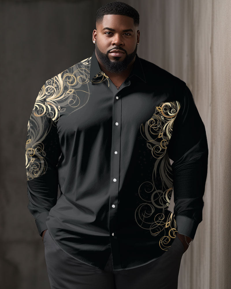 This black long-sleeved shirt is decorated with simple yet gorgeous golden floral prints, exuding a strong retro style. It is tailored to perfectly outline the upright posture of men, and the oversized size provides a strong body tolerance. Although its design is simple, it is extremely versatile and can be easily matched with casual jeans or formal dress pants.
