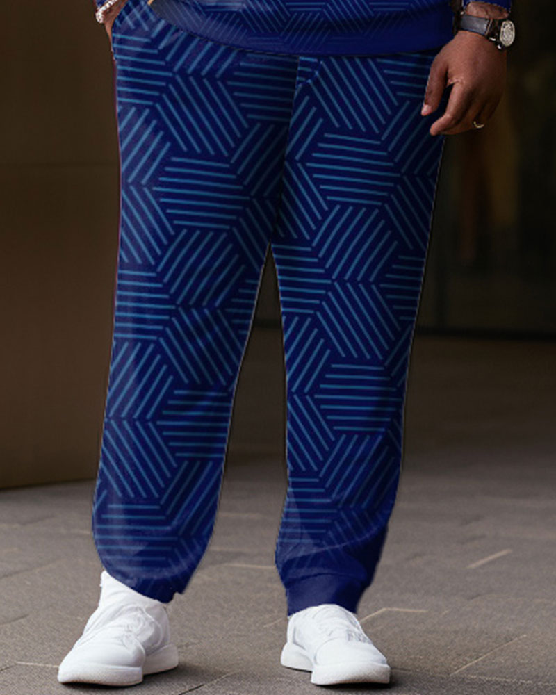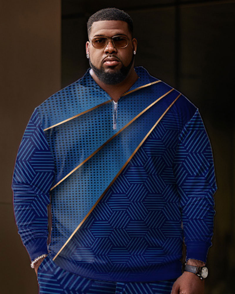 This geometric graphic plus-size men's polo zipper shirt and trousers set brings tailored style to any business occasion. The polo combines a classic collar with a modern zipper for a fresh, refined look, made from breathable fabric for all-day comfort. The slim-fit trousers complete the set with a sleek, straight-leg design that enhances your silhouette. Ideal for formal settings yet versatile enough to mix and match, this set is a sophisticated choice for men who value both style and comfort.