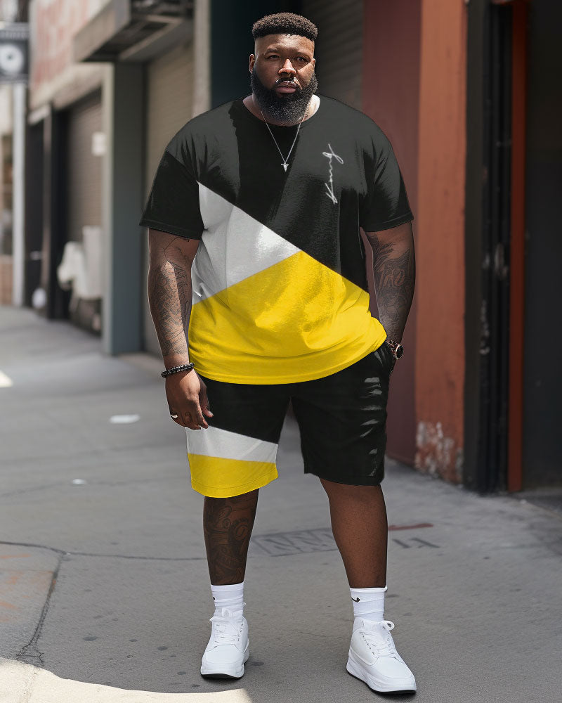 Elevate your summer style with a color-blocked splicing style in this set. The combination of yellow, white, and black is classic, while the artistic lettering print adds a unique touch. Its loose, relaxed fit creates comfort while maintaining a cool vibe. The simple design ensures versatility, making it ideal for plus-size men seeking a casual, stylish set.