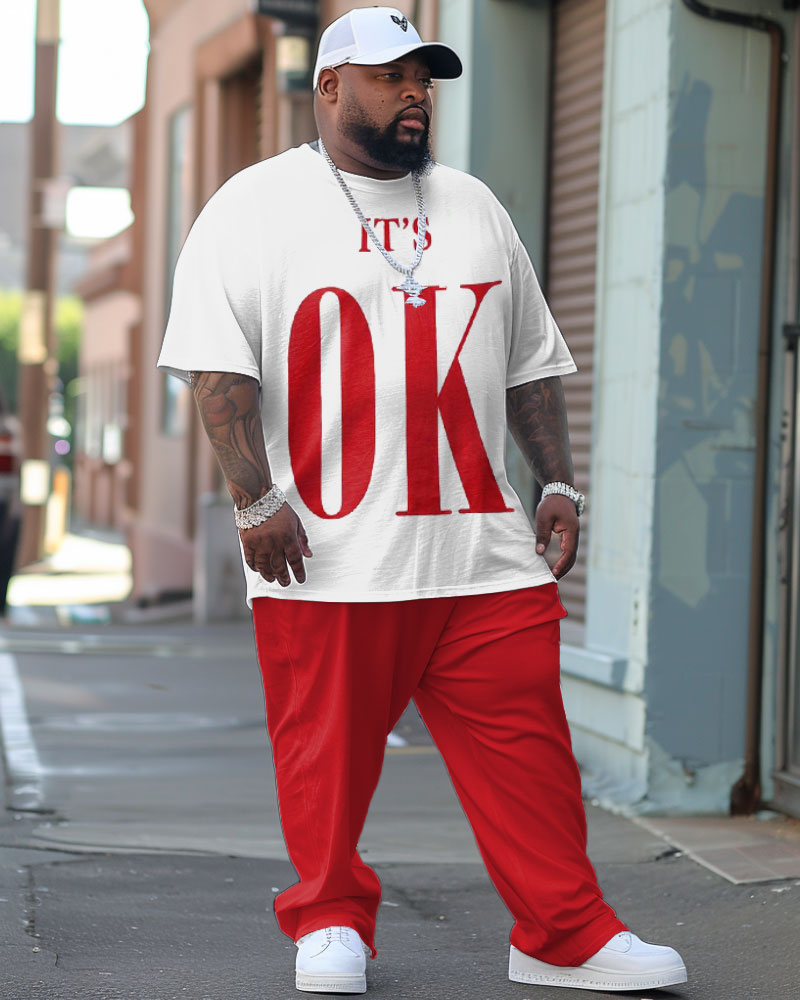 Men's Large Street Casual OK Alphabet Print T-Shirt Trousers Suit